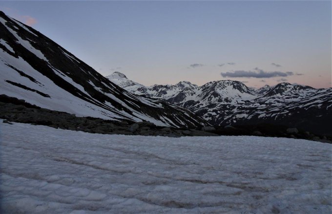 die Schneeschmelze ist auch hier in vollem Gange. Start um 5.15 Uhr. Ab Hospiz haben wir die Ski ca. 30 Min. hochgetragen. Die Schneedecke dann hart tragend. Zweimal kleine Tragpassage. Die Traverse unter dem Hübschhorn nicht ganz tragend. Ski kurz geschultert und zu Fuss traversiert. Danach ohne Probleme auf harter Schneedecke bis auf ca.3000m. Ab hier eisige Schmelzkruste. Aufstieg eher auf der rechten Seite da weniger vereist.