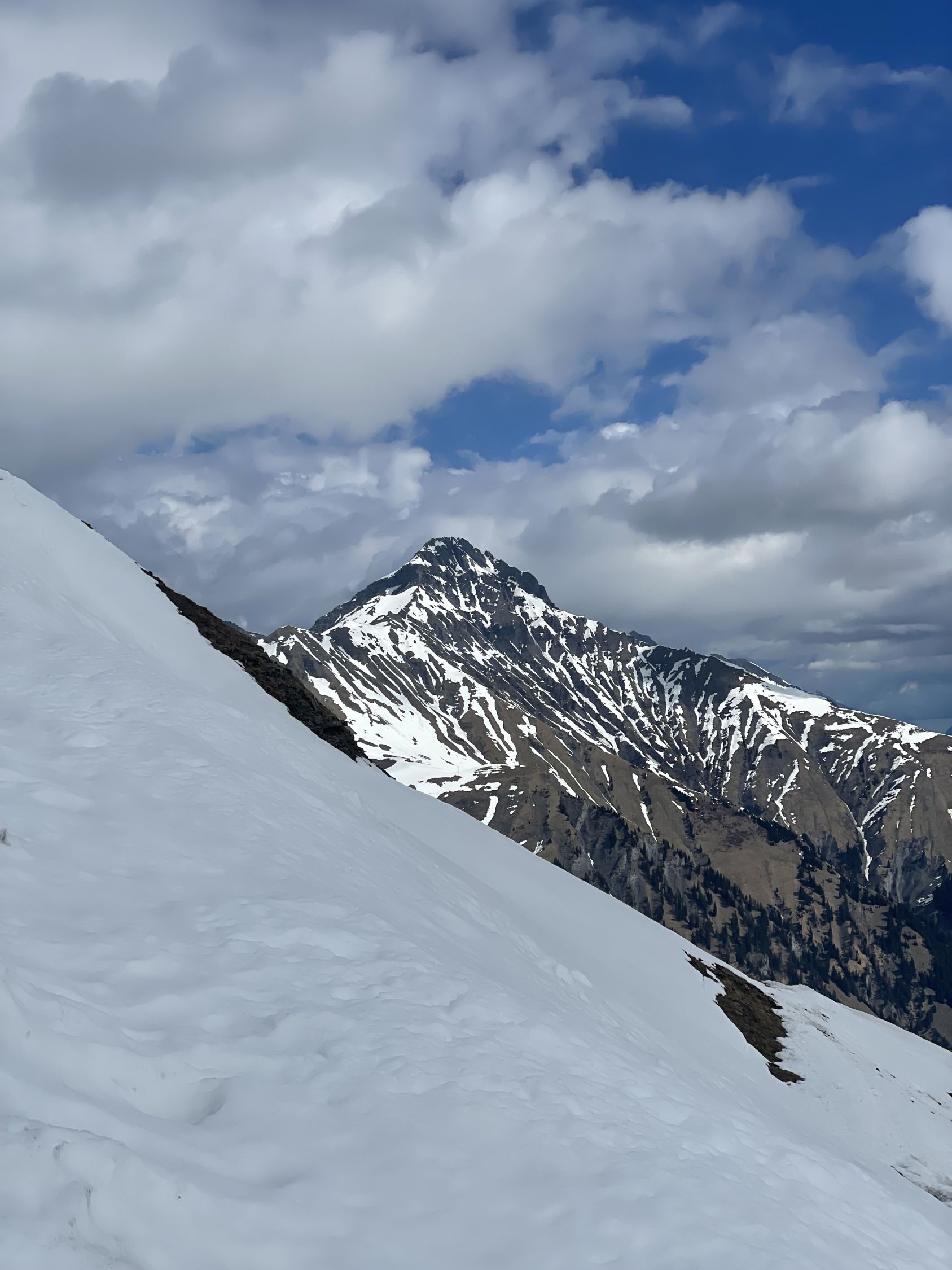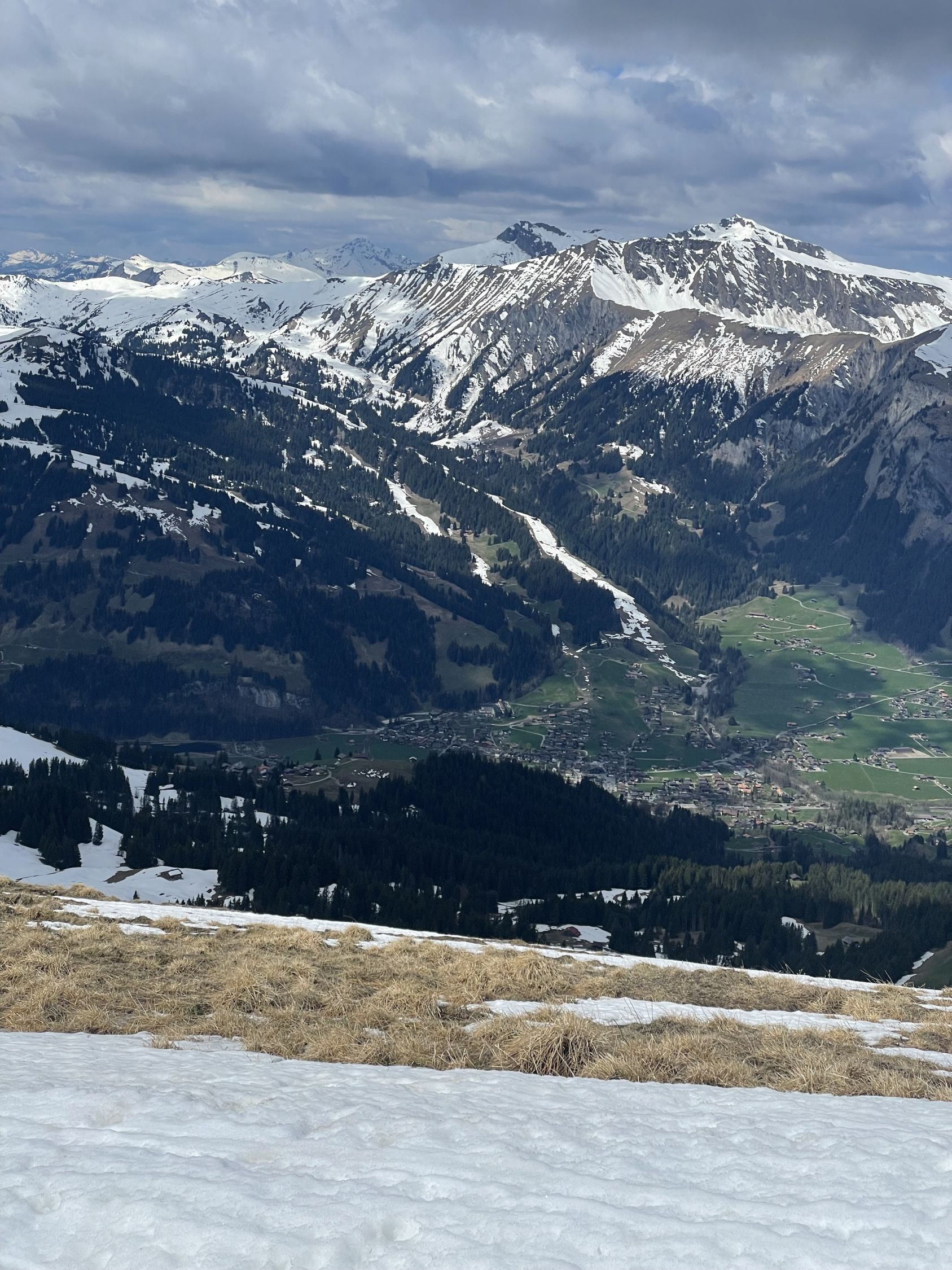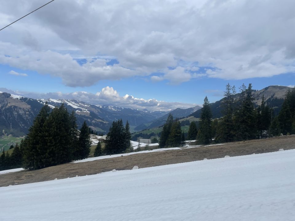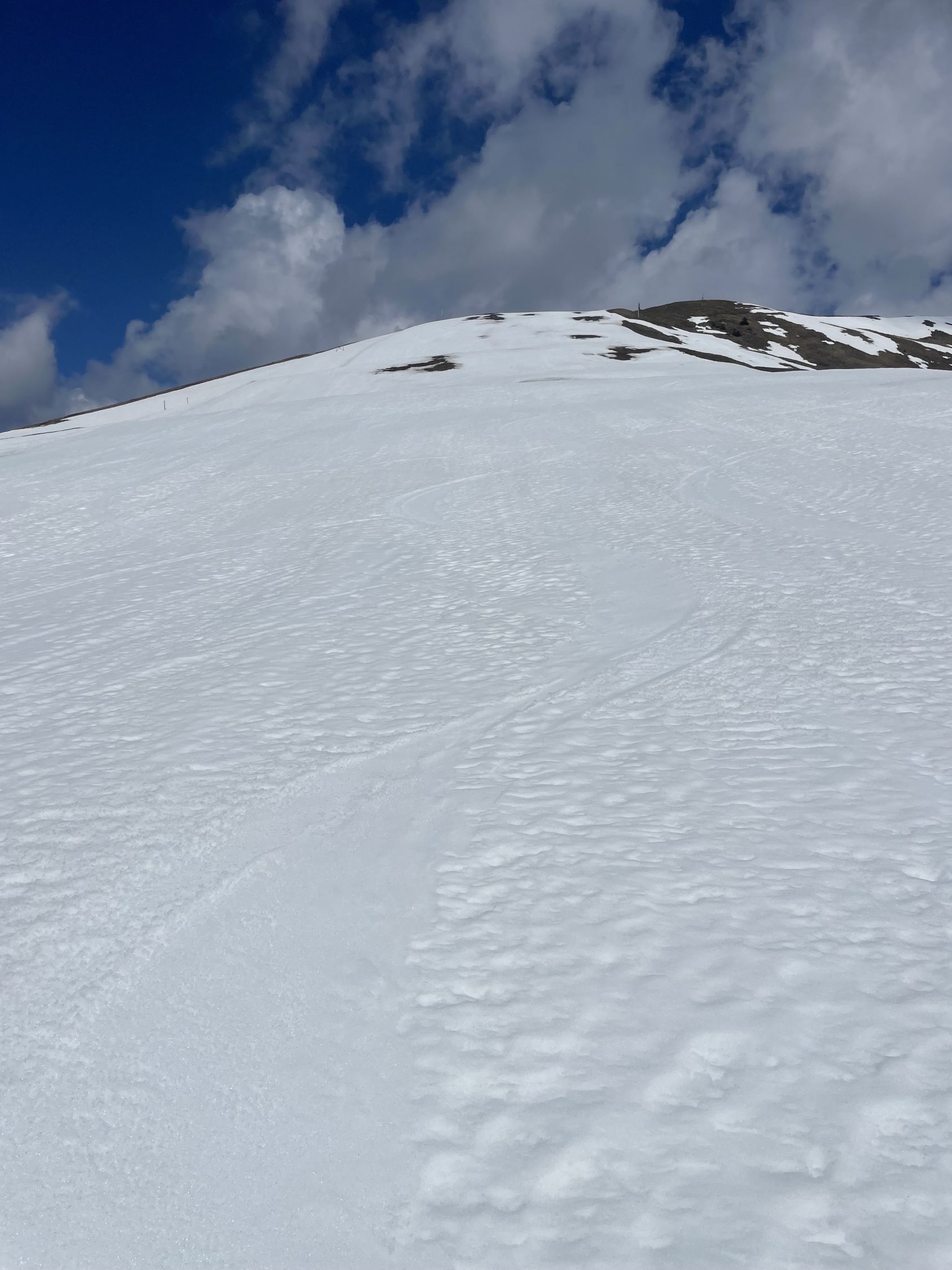 Als ich kürzlich auf dem Leiterli war (also dem in der Lenk, nicht dem daheim), dachte ich mir beim Blick auf die andere Talseite, dass man es dort auch mal probieren sollte. Die bewölkte Nacht und der etwas unsichere Wetterbericht bestärkten mich darin, das heute zu tun. Mit dem Auto geht es bis Bühlberg, von da an den Pisten nach zum Hahnenmoos und weiter zum Ziel. Das Wetter war entsprechend dem Bericht wechselhaft, aber die Regenjacke konnte im Rucksack bleiben. Oben wartete ich ein Sonnenfenster für die Abfahrt ab. Das kam auch und bis unterhalb Hahnenmoos war es ausgezeichnet. Darunter dann etwas viele Ratrsckspuren, aber das hat es nun mal. Ganz unten wieder sehr gut.