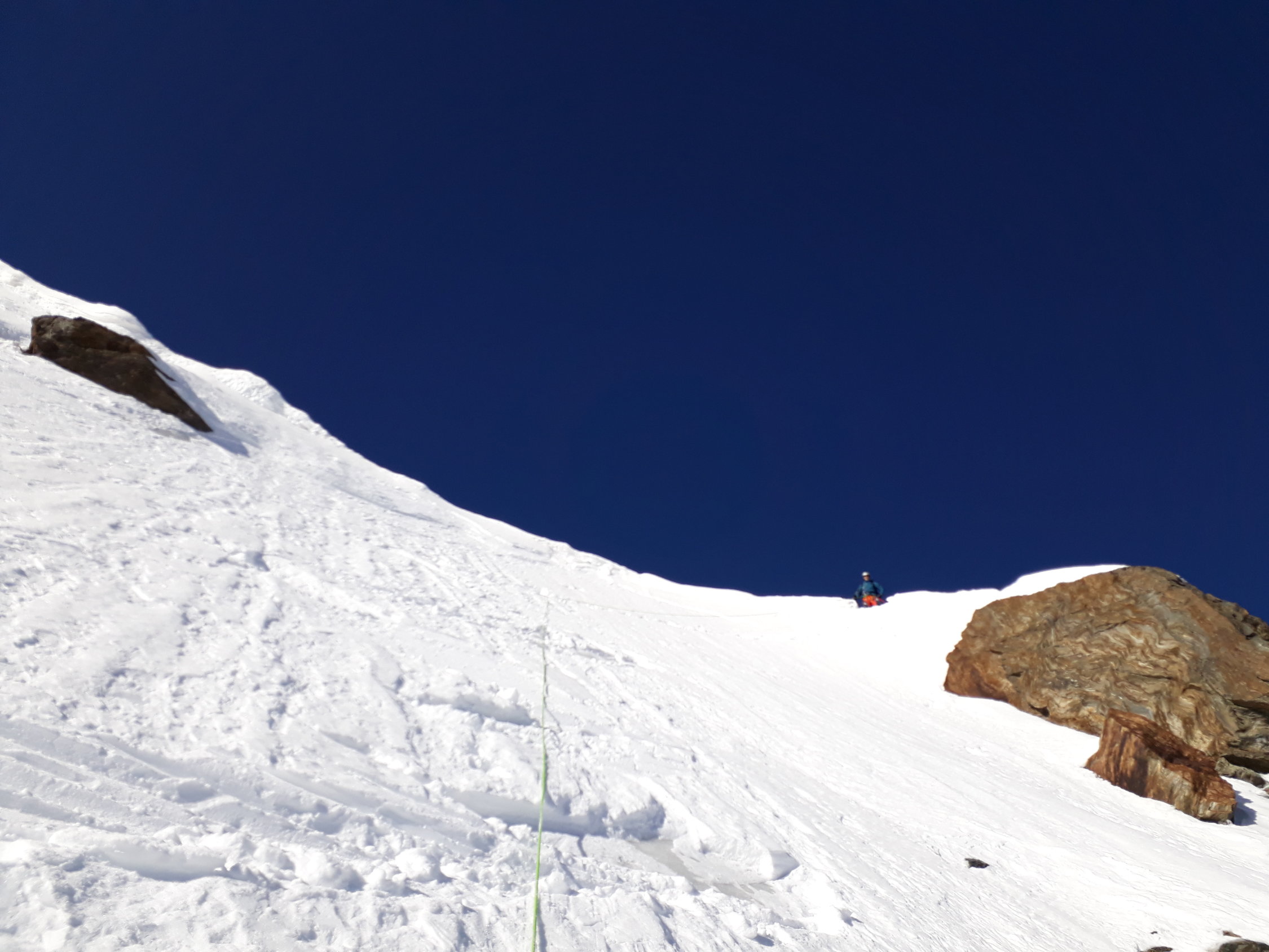 Im Allgemeinen guter Trittschnee in der Wand. Nur in den oberen 100 Metern liegt das Blankeis unter ca. 20 cm pulvrigem Schnee und schaut an manchen Stellen auch hervor.