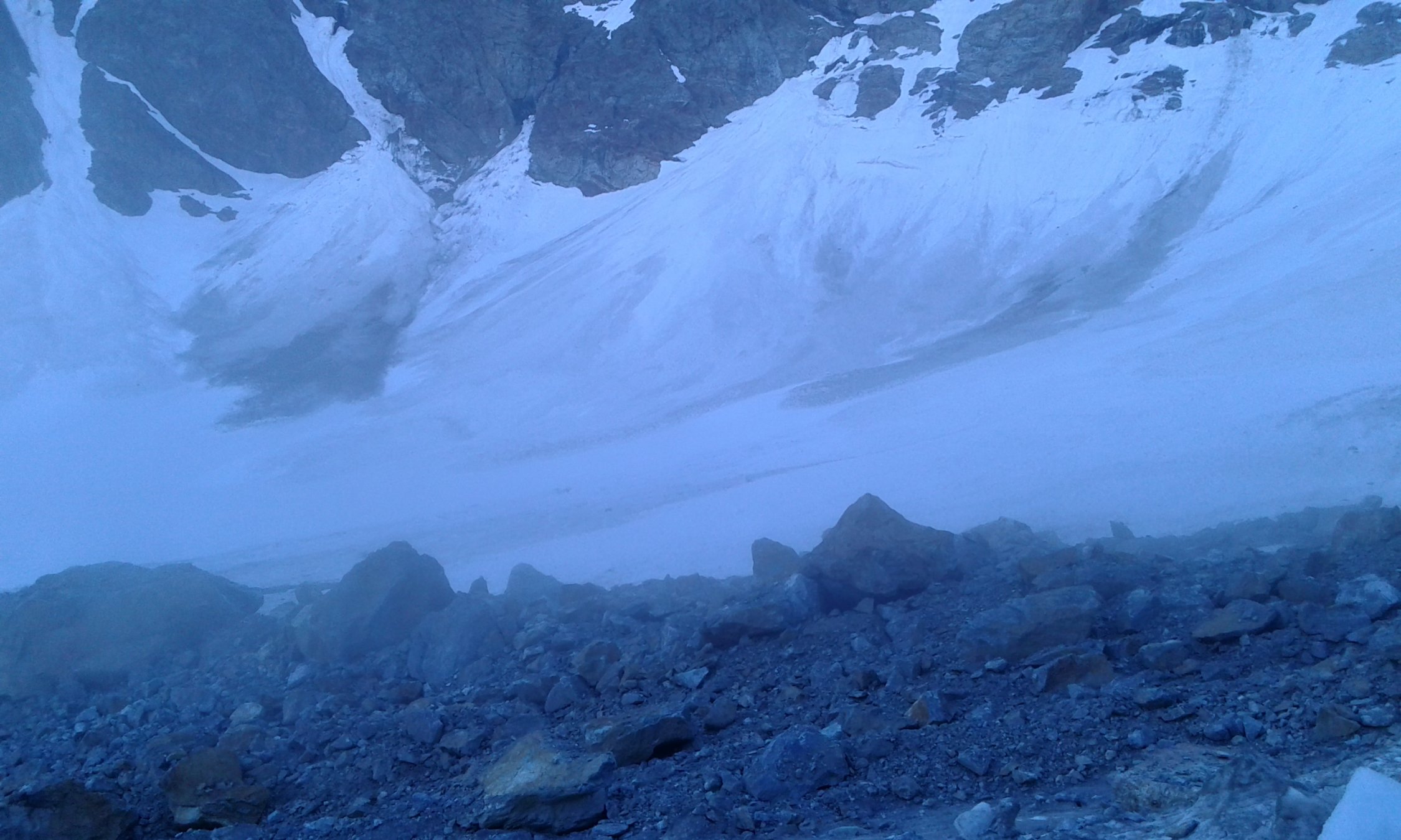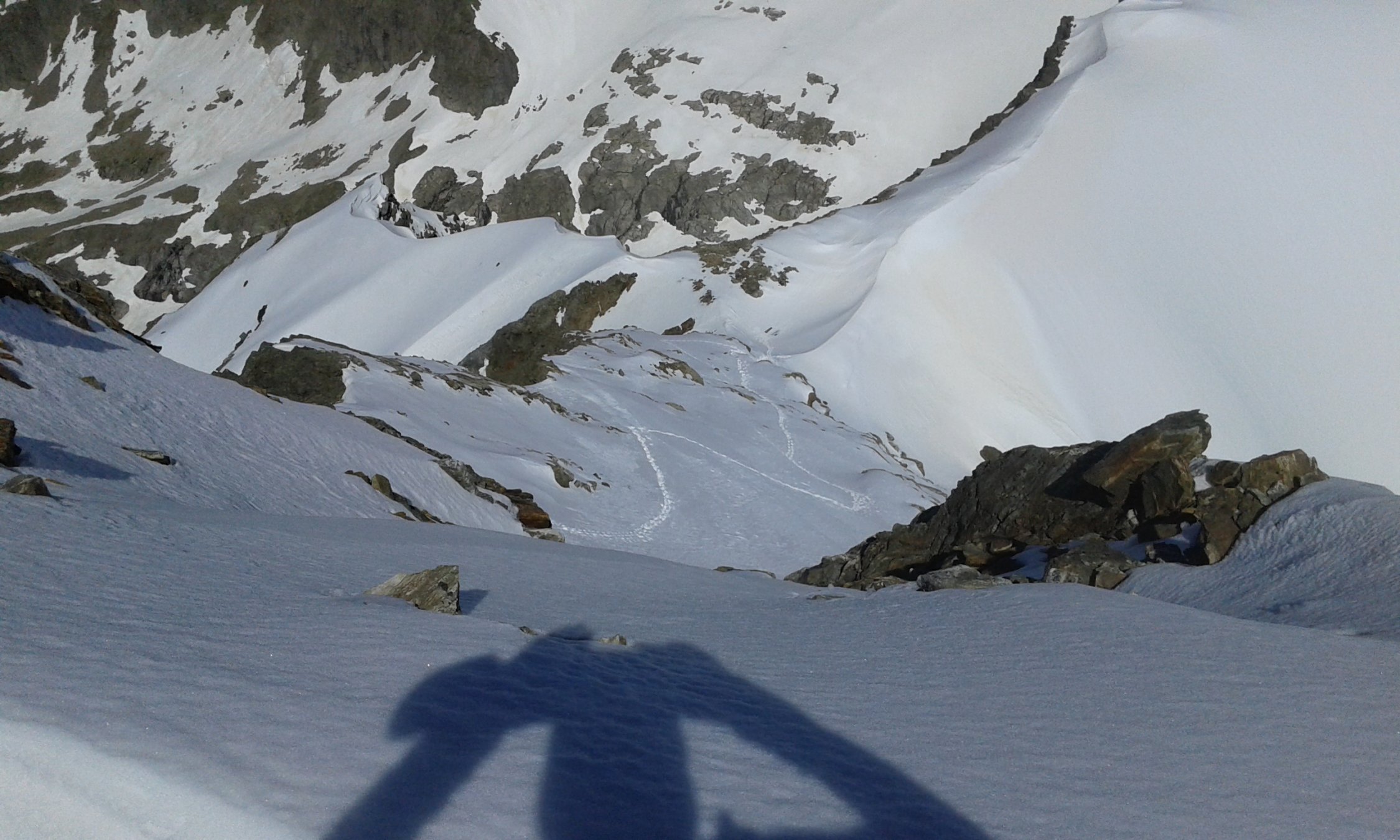 Ab Umpol Ski gleich getragen bis 2150 - quasi mal erst um die Ecke schauen, sonst zieht man sie an und gleich wieder ab. Danach gut auf Ski machbar bis 2380. Kurz für 100Hm auf Steigeisen umgesattelt. Danach mit Ski weiter über Mittler Tierberg bis Depot. Schlussaufstieg zu Fuss (hatte Spur von zwei anderen Tourengängern heute und wohl auch deren 1-2 von gestern drin). Sehr gute Aufstiegsverhältnisse im Couloir. Hat insgesamt 5 Bohr-Haken, wenn man sie alle findet. Abklettern möglich, abseilen dito (1x20m, 1x25m).