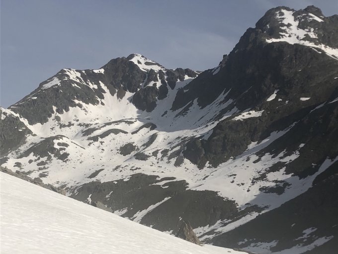 Start beim PP Dürrboden um 06:20. Zu Fuss mit aufgebundenen Skis etwa 1h bis 2350MüM. Ab hier bis unter den Gipfel problemlos zu gehen, alles ohne Harsteisen. Gipfelwand schon ziemlich ausgeapert. Das Coloir hat nur noch knapp Schnee. Wir haben uns für den Sommerweg entschieden. War etwas unangenehm. Hier scheint nichts so richtig festgemacht. Ein Königreich für ein paar Ketten.