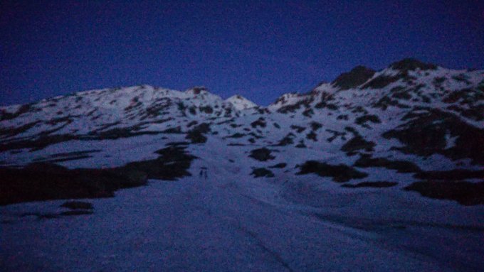 Heute ideale Verhältnisse im Gebiet . Nach einer klaren Nacht, war der Schnee am Morgen noch pickelhart und trotzdem griffig. Wir sind heute früh gestartet, und konnten somit das "Zeitprogramm" einhalten. Aufstieg zur Valetta - Lücke soweit ohne Probleme im 2. steileren Teil die ersten Sonnenstrahlen im Hang. In diesem Bereich Harscheisen sehr nützlich. Bei vom Valettapass rechts ausgeholt, der Schnee war gfiggig, drehbar gegen 2500 kleine Wellen und Sommerschnee. Tip Top für diesen Teil. Aufstieg sehr angenehme Spurführung inklusive Gipfelhang. Gipfel ab Skidepot, Pickel anstelle von Skistöcken von Vorteil, heute keine Steigeisen notwendig.