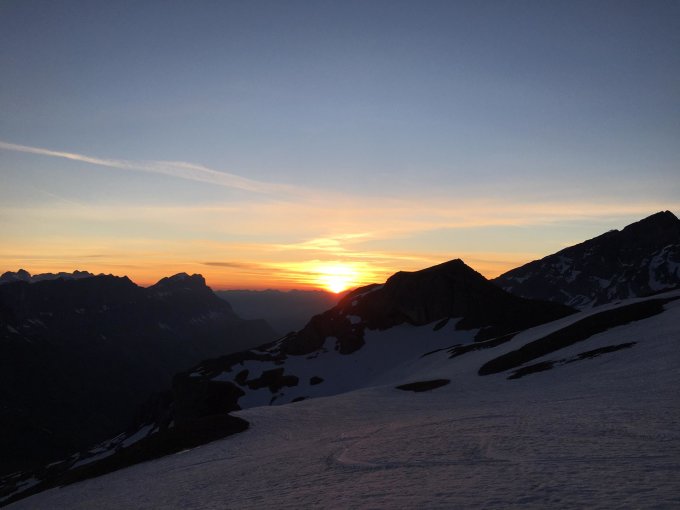Im Aufstieg müssen die Skis zur Zeit ca 200 Hm getragen werden, abhängig davon wie optimal man den Weg im Dunkeln nimmt. Wir sind um 0430 gestartet aber schon kurz nach 5 war keine Stirnlampe mehr nötig.