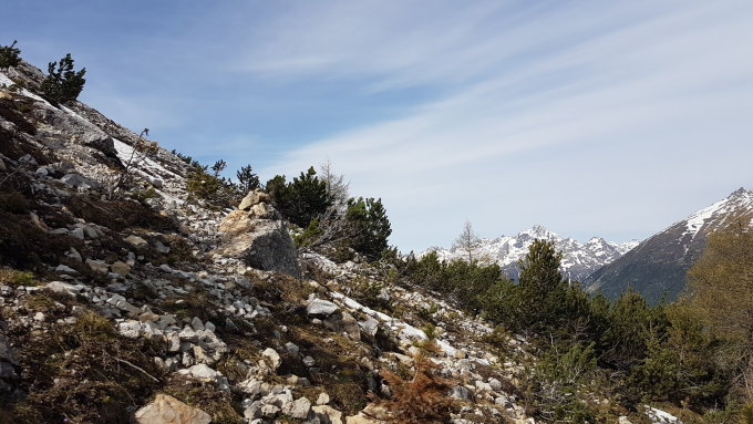 Beim Aufstieg durch den Wald sind verschiedene Varianten beschrieben. Ich bin bei der kleinen Holzhütte bei P1802 und den Wildschutztafeln direkt hoch gegangen. Geht steil hoch, doch da das Gras noch nicht hoch ist bin ich gut vorwärts gekommen. Die Felsen auf ca 1950m habe ich rechts umgangen und dann weiter Richtung oberes Ende Waldschneise. Dort wäre besser, etwas näher bei den Felsen hoch zu gehen. Habe dann schnell eine Schneise in den Legföhren gefunden und am Ausgang bereits den ersten Steinmann gesehen. Von hier aus habe ich die Felspartien bevorzugt, man findet aber auch immer einen Weg zwischen den Felsen, dafür etwas rutschiger. Bin bis zum Gipfel praktisch ohne Schnee durchgekommen. Bin dann noch weiter auf den Ostgipfel P3000. Auf dem Grat hat es doch noch viel Schnee, zeitweise kann man diesen etwas südlich umgehen. Bin dann noch weiter bis kurz vor P2856 und dann in steilem und losen Gelände den Südhang hinunter zur Stevel da la Bes-cha und durch das Val Chamuera zurück nach La Punt. Ganz oben ist der Abstieg recht heikel, das Gelände ist steil und rutschig.