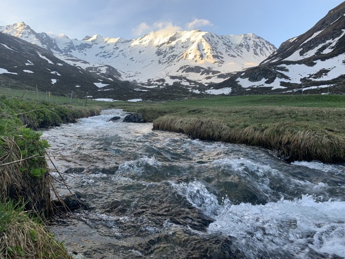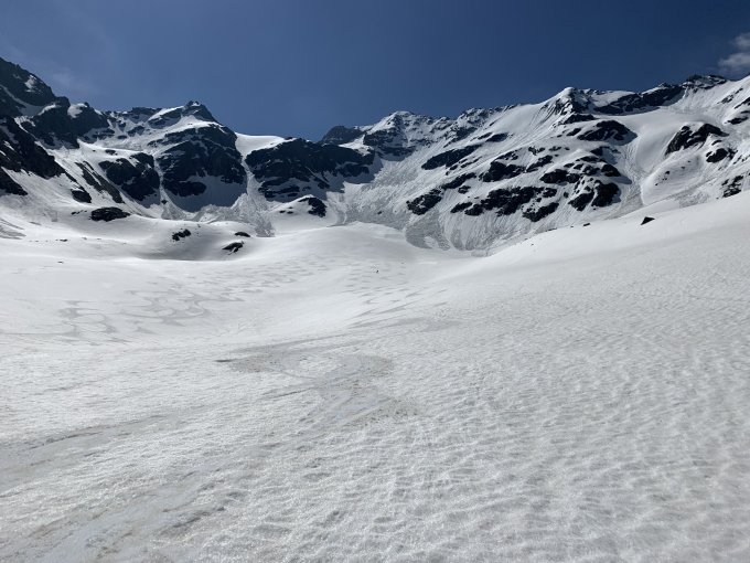 Ab PP Dürrboden 6.10 Uhr 1 h dem Sommerweg entlang getragen bis ca.2350. Weiter dem NOCH Schnee überdeckten Bach- Talverlauf folgen. Hüttenweg aper bis ca 2500. Den Aufschwung zu P.2665 mit Harscheisen gestiegen. Ab hier dem aufsulzenden Gletscher zu Fuorcla Vallorgia zum südlich ausgerichtete Couloir. Mit Pickel und Steigeisen Ski aufgebunden zum Gipfel. Nordabfahrt Gipfelhang (ca. 50 Grad) hart, bei ca. 2970 zum restlichen Scalettagletscher gequert (Achtung Felswände Absturzgefahr) den mit Lawinen übersäten Hang hinunter bis 2700 kein Traum. Gletschtälli schöner Firn. ( Genau so will man es ) Fahrbar bis unter Schönbüel 2120 Sommerschnee.