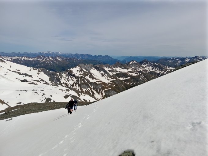 Wir sind als gemütliche Gruppe in die SAC Sardonahütte von St.Matin aus gewandert ca.3h guter Weg bis zur Alp dann geht's einige gute Höhenmeter bis zur Hütte hoch. Am nächsten Morgen sind wir früh los um auf den Piz Dolf welcher noch ziemlich verschneit ist, uns jedoch gesagt wurde das es gut möglich ist ihn zu besteigen. Den Angaben der Hüttenwartin folgend konnten wir ungefähr den Weg schätzen sind jedoch über jegliche Schneefelder gestapft. Um den Abstieg machten wir uns zuvor sorgen, haben es uns jedoch mit einer knackigen rutschpartie die Schneefelder hinunter einfach gemacht. Die Steilen Schotterhänge die wir sonst hätten runter müssen waren unangenehmer und auch schwieriger begehbar. Der Aufstieg hat ca.4h gedauert unten wahren wir in 1,5h:)
