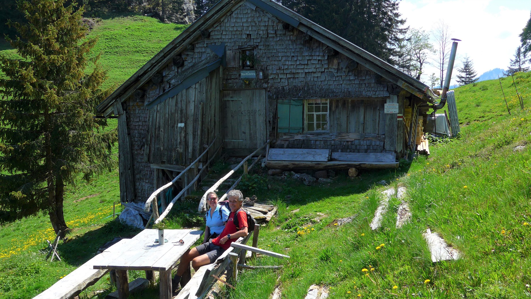 Die urige Hütte der Bocksbergalpe lädt zu einer kurzen Rast ein und ehe man sich versieht, steht man auch schon oben, auf diesem aus dem Wald herausragenden Felszahn.