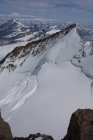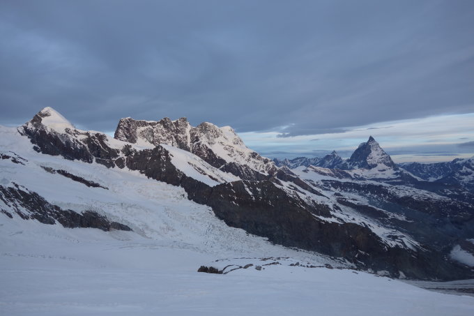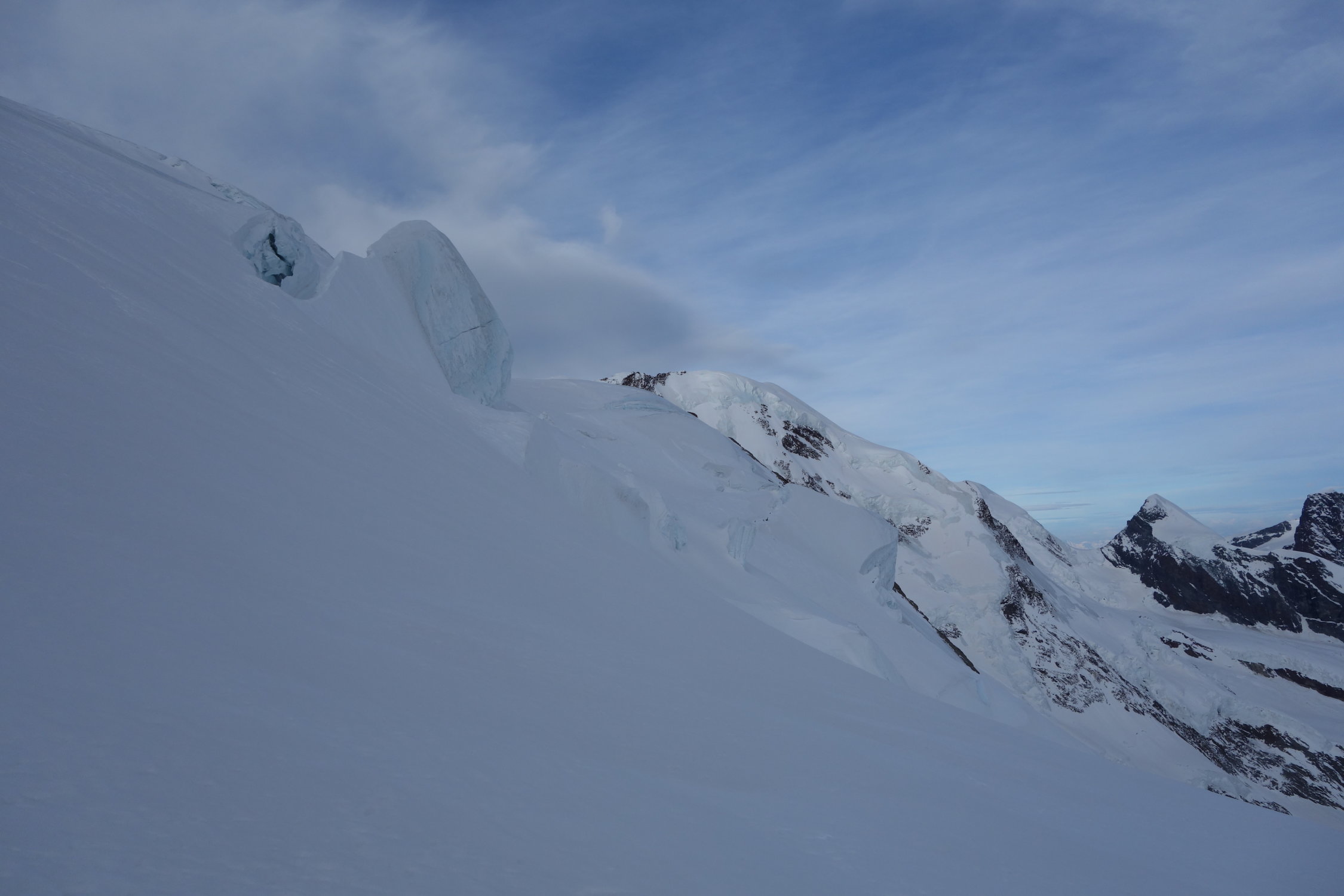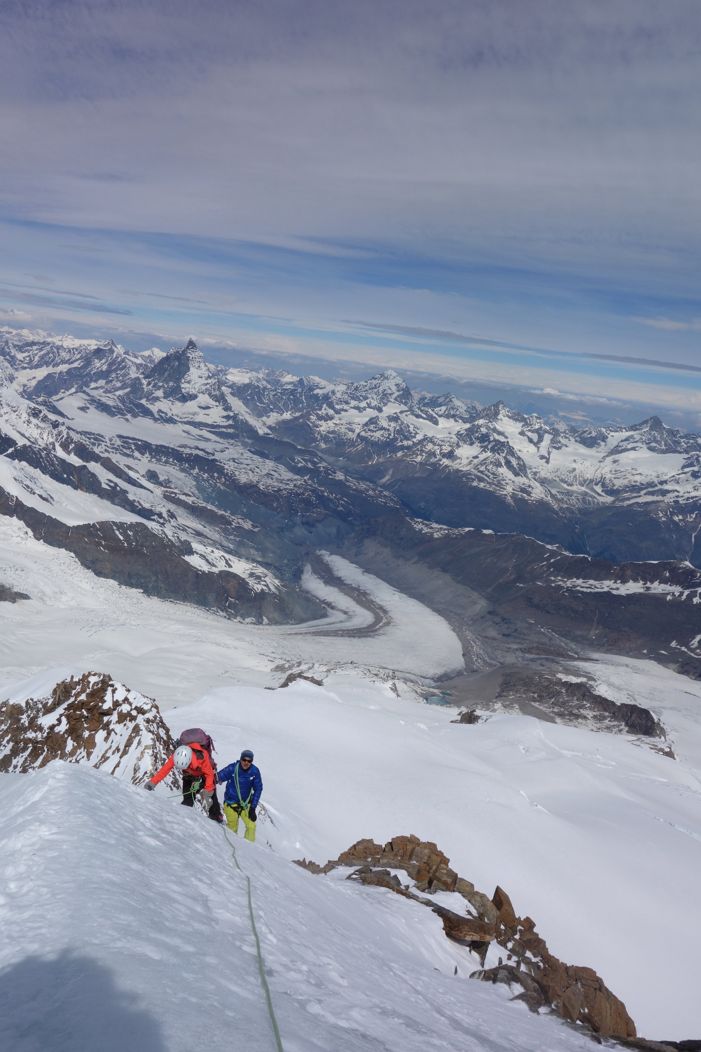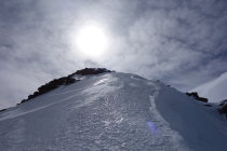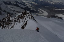 Start um 4:30 von der Monte Rosa Hütte. Erster Aufstiegshang (ca.1km nach Hütte 30°) sehr eisig, kaum eine Skitourenspur, sind deshalb mit Steigeisen hoch. Sonst Gletscher gut eingeschneit, beim Skidepot um ca. 8:30.