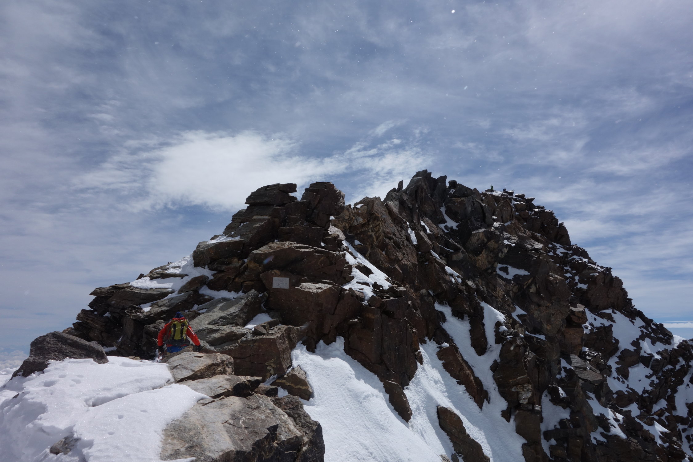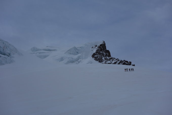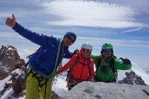 Firnanstieg hat mehrere, 10-20m eisige Passagen und wir haben Eisschrauben gesetzt, Kamin auch Blankeis, am Gipfel erst um 12:00! Eisgerät und pro Person 2 Eisschrauben wären hilfreich.