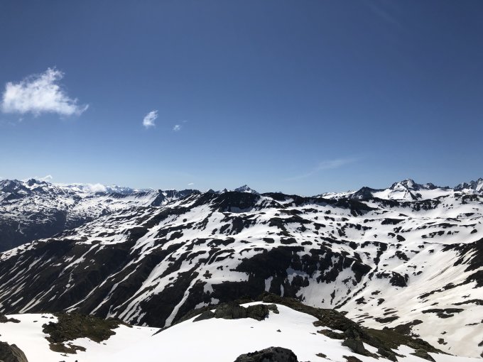 Ich war heute etwas spät dran und von Anfang an nicht mit der Absicht unterwegs, den Gipfel zu erzwingen und dafür womöglich eine schöne Abfahrt zu verpassen. Zuerst mal der Latsch vom Tiefenbach zum Sidelenbach, dort noch eine kurze Tragestrecke ums Eck und dann ein sehr schöner Aufstieg über die abwechslungsreichen Hänge Richtung Punkt 2814. Dabei fand ich Harscheisen angenehm, und ich nehme an am Grat oben gilt dies umsomehr. Knapp unter dem Grat liess ich es gut sein, etwa 2750 MüM, es war schon nach 10.00 und die Osthänge bekommen viel Sonne. Schöne Pause im Windschatten und dann eine im oberen Teil sehr schöne Abfahrt mit Firn al dente. Im unteren Teil dann etwas welliger, aber gut tragend bis ganz unten. Dann das Gelatsche zurück der Strasse nach, meine kaputte Hüfte hat heftig protestiert, aber... s unten