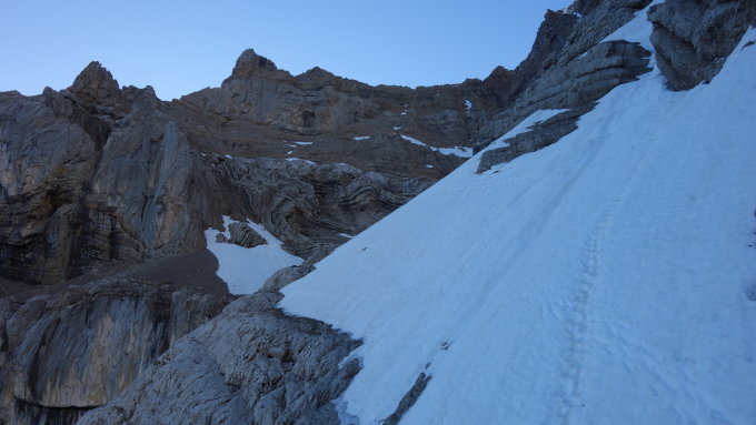 Ich bin morgens um vier auf der Schwammhöhe gestartet, bis zur letzten Alp kann man gut mit Lampe gehen. Für den Chnoren braucht man Sicht. War um Sechs auf dem Chnoren und es hatte schon etwas Steinschlag zu Beginn des Schneeteils, weiter oben weniger. Gipfel 9.00 Uhr.