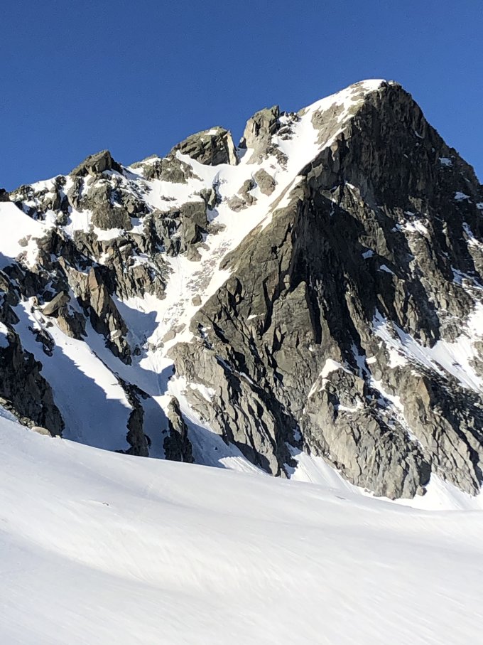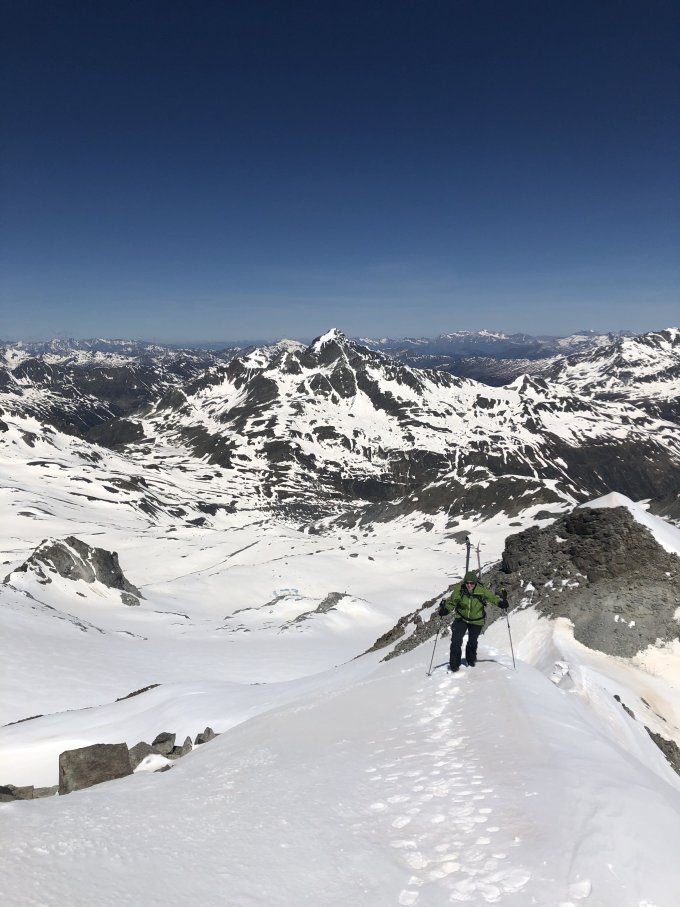 Start beim Türelerparkplatz auf 2300 kurz nach 6. Die ersten 200 Höhenmeter ziemliches geeier und recht viel Volk. Danach gut zu gehen. Ab Abzweiger Fuorcla Radönt waren wir alleine. Sind heute auch auf dem Hinweg ins Val Grialetsch abgefahren. Die Traverse ab Fourcla Radönt hat mittlerweile 3-4 trockene Stellen, die Längste ca 100m. Sind mehr oder weniger den Markierungen gefolgt und erst kurz vor der Hütte ins Tal abgefahren. Die Flanke hat im unteren Teil zu wenig Schnee, um schon früher runterzuziehen. Haben uns verleiten lassen schon etwas oberhalb des Talbodens anzufellen, um Höhe zu sparen. Bringt nix! Unbedingt bis Pt 2373 abfahren oder dann halt den Normalweg über die Hütte und rund um den Grialetsch-Kessel nehmen. Aufstieg rechts (westlich) an der Isla Persa vorbei. Gipfelhang braucht Harsteisen. Ab Einsattelung zwischen Pt 3132 und Gipfel dann zu Fuss dem Grat entlang. Ski haben wir aufgebundenen. Guter Trittschnee aber etwas luftig.