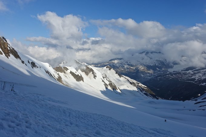 Herrliche Abfahrt im oberen Teil, so dass sich der Gegenanstieg zur Tällilücke, bzw. P. 2763, bestens lohnte.