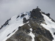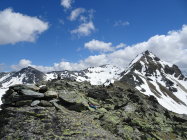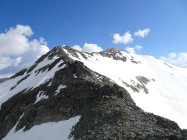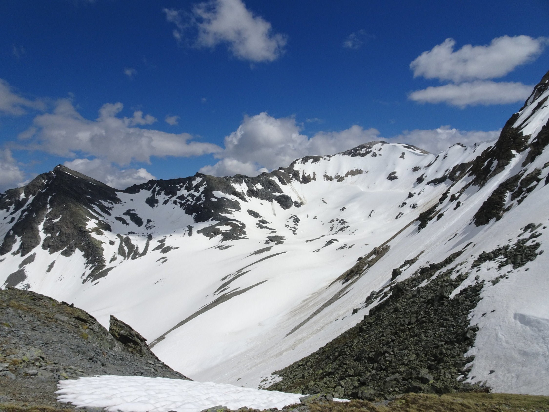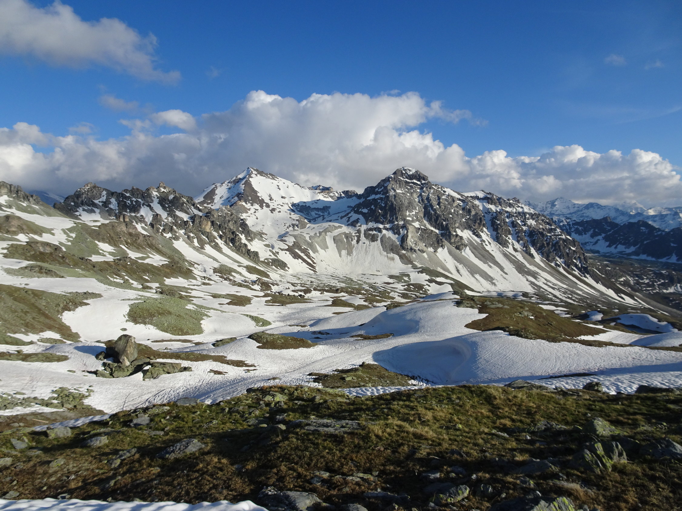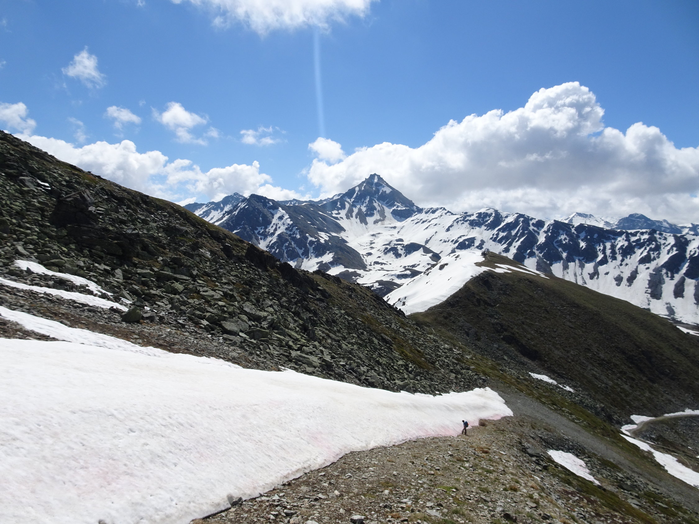 Die Verhältnisse sind im Vergleich zu anderen Jahren für diese Jahreszeit ausserordentlich gut. Wir haben bis und mit Schwarzhorn keinen Schneekontakt gehabt (ausser beim Abstieg vom Illhorn, welcher aber trocken über den Weg bewältigt werden kann). Bis an den Fuss des Rothorns lief alles problemlos. Auf den Direktanstieg zum Rothorn haben wir verzichtet, weil neben den Gipfelfelsen ein steiles Schneefeld lag, das man hätte queren müssen und dessen Stabilität von unten nicht einzuschätzen war. Wir sind also vom Grat aus südöstlich in die Mulde nördlich der Bella Tola gestiegen und bei P 2910 auf den Nordostgrat der Bella Tola gekommen. Dieser besteht auch aus instabilem Blockgelände. Die drei Felserhebungen, die man bis zum Vorgipfel überwinden muss, umgeht man westlich auf Bändern oder direkt über das Blockgelände. Vom Vorgipfel (Ende des steilen Gratabschnitts) bis zum Gipfel gelangt man über wegartige Strukturen.