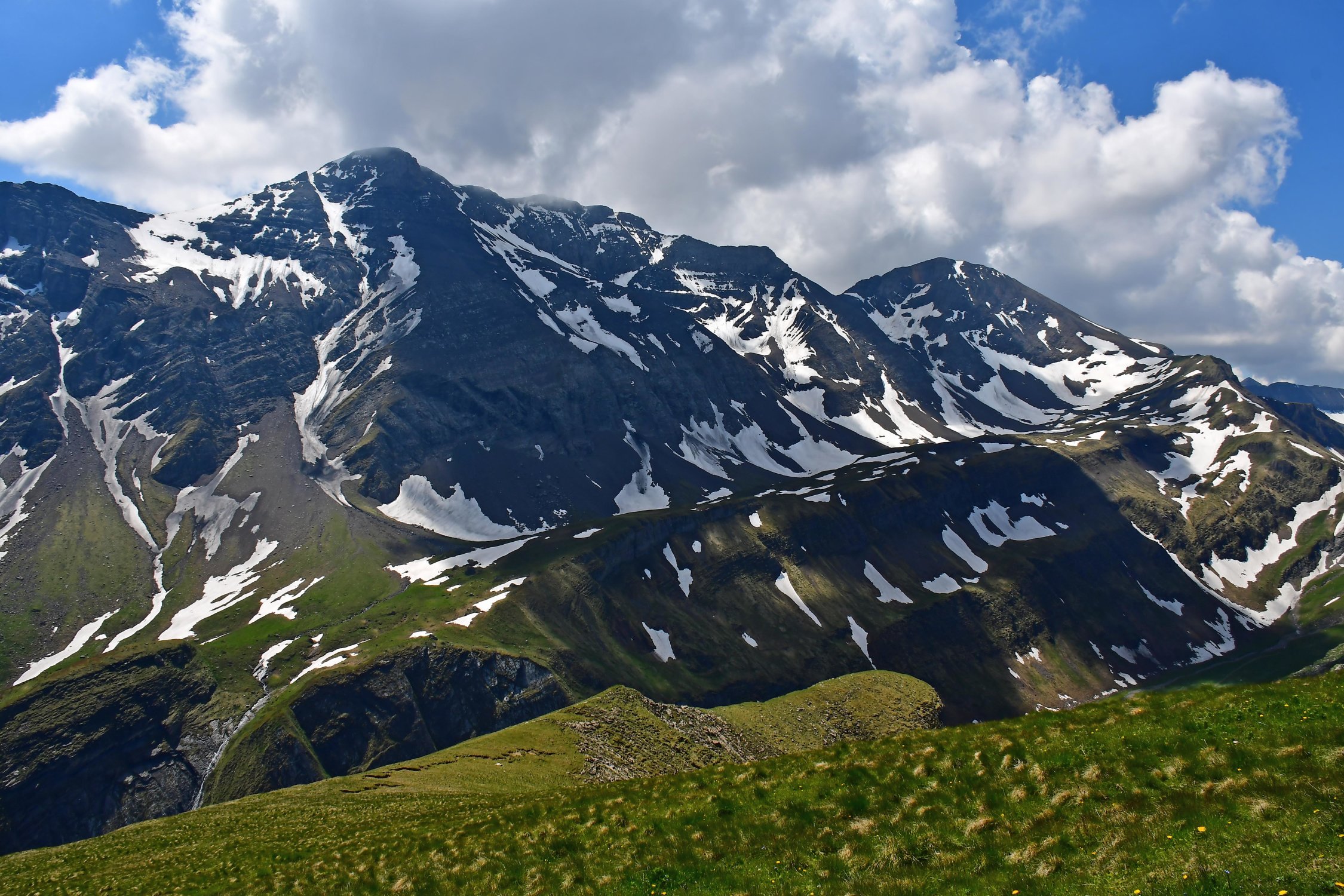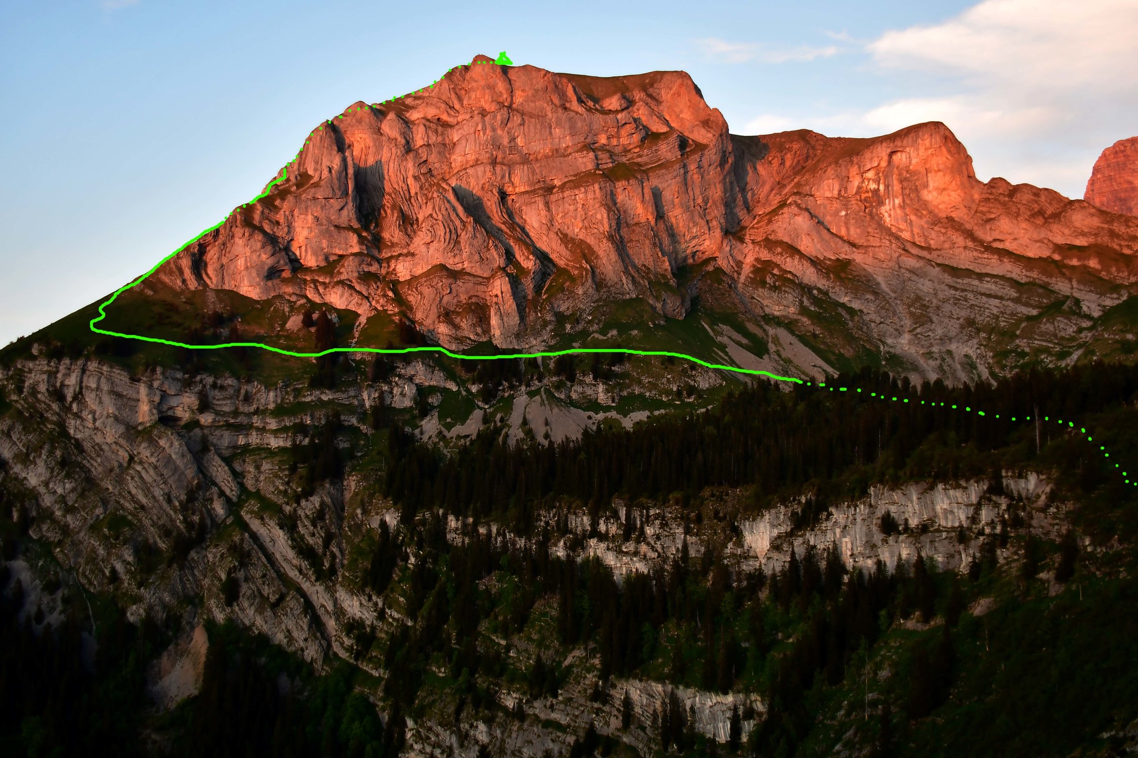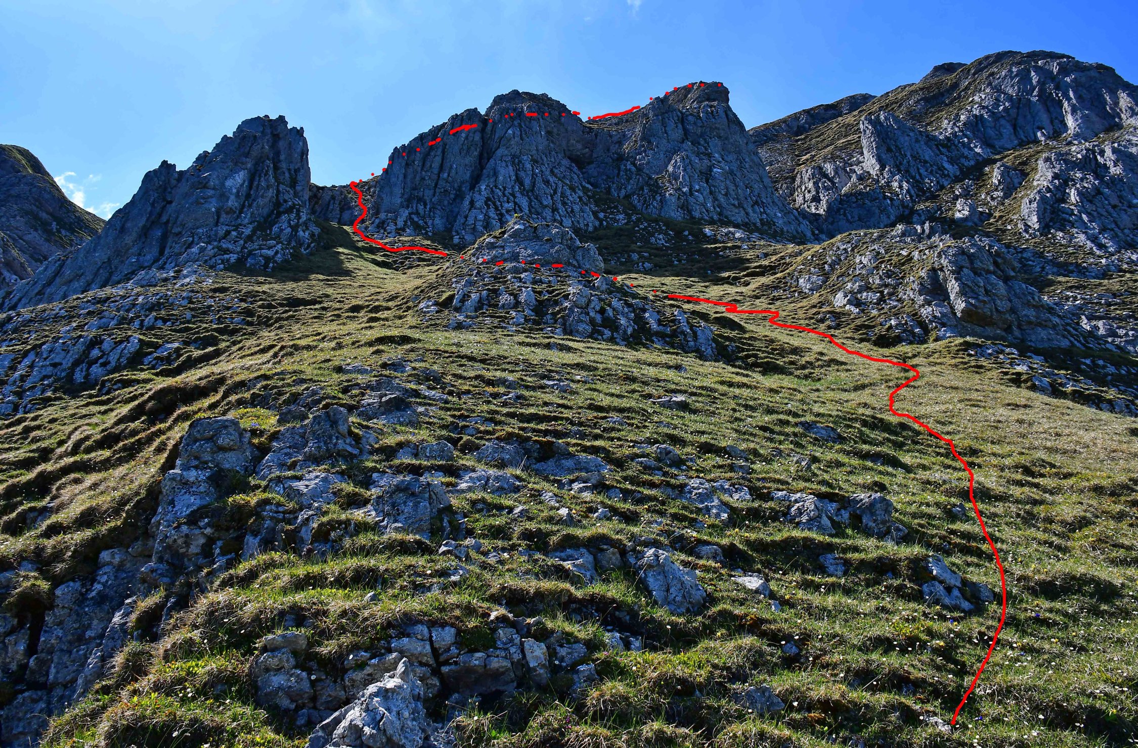 Alles (fast) trocken, also leicht feucht vom Morgentau. Für diese Route ist es wichtig, dass es trocken ist, weil sie meistens über recht ausgesetzte Grashänge von Zirka 35° verläuft. Die Schafe, die von der anderen Seite hinaufgeführt werden sind noch nicht da.