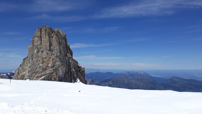 Eigentlich wollten wir zuerst auf den Dammastock. Der Föhn machte diese Tour aber zu unsicher (Schneefall, Wolken, wenig Sicht ...) und so entschlossen wir uns noch vor 4 Uhr für das Rotstöckli (dem höchsten Nidwaldner) und den Titlis (dem höchsten Obwaldner) noch als "Zückerchen". War tipptoppe Entscheidung, da wir bereits ab Bergstation Stand ganz alleine waren. Ein Skifahren haben wir gesehen, der am Titlis unterwegs war. Ab Stand kam der Schnee und der starke Wind. Doch die Sonne lachte uns entgegen und wir legten die Spur durch den Schnee von Stange zu Stange bis zur Leiter. Bei der Talstation des Skilifts angeseilt und mit Schneeschuhen weiter. Diese haben uns sehr geholfen! Klettersteig Rotstöckli sehr gut abgesichert. Der Einstieg war etwas mühsam, da noch viel Schnee ums Steinschlaggitter lag, nachher den bröckeligen Fels hoch zum Gipfel. Vor dem Gipfel lag das Seil unter dem Schnee. Wir haben es jetzt "sichtbar" gemacht. Eine Verankerung ist immer noch ausgerissen, geht aber trotzdem problemlos. Gipfel genossen, war nicht einmal mehr so windig da :-). Der Weg zum Titlis war mühsamer, da viel Schnee lag. Dafür waren wir dort die Einzigen, Aussicht perfekt. Hat sich gelohnt. Abstieg auf gleichem Weg zurück (ohne Rotstöckli ;-)). Gemse, Wiesel und Murmeltier gesehen.