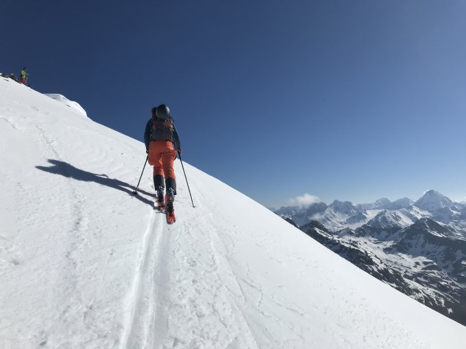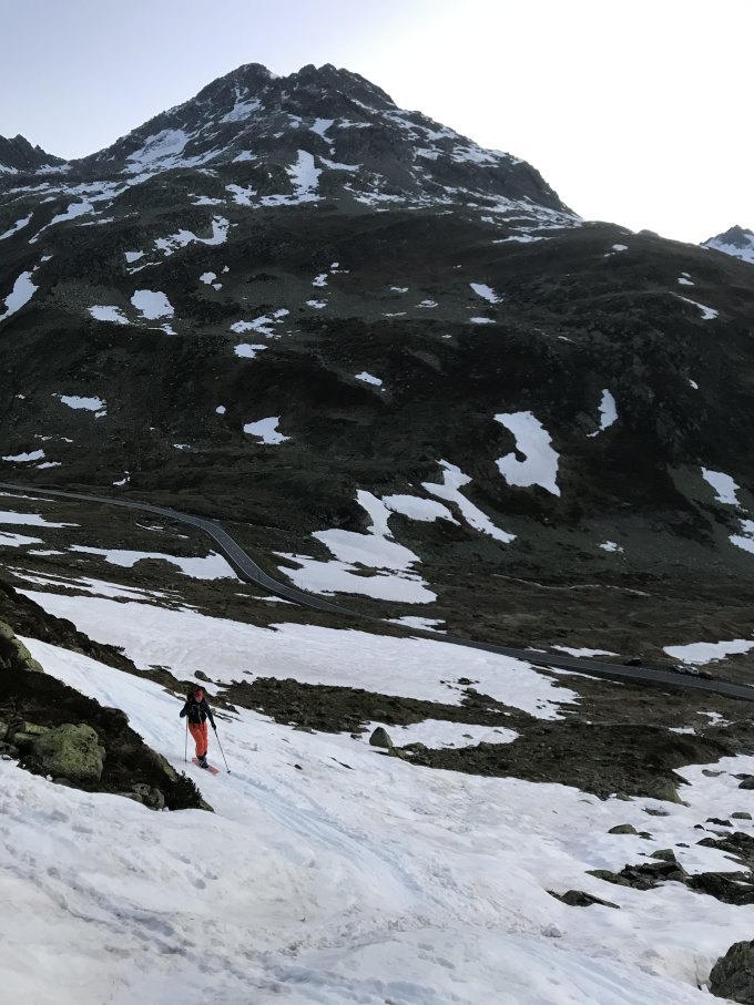 Start um 4:50Uhr bei 3 Grad. Schnee nach klarer Nacht tragend. Derzeit noch direkt ab Passstrasse möglich mit kurzer Unterbrechungsstelle. Im ersten Hang sind Harscheisen angenehm. Danach nicht mehr nötig. Bachquerungen müssen nun ohne Schneebrücken gemeistert werden. Nach den Bachquerungen noch viel Schnee - reicht noch eine Weile... An der Schwarzhornfurgga dann im Steilaufschwung ca. 100 m Ski tragen und zu Fuß über den Sommerweg. Oben dann wieder problemlos mit Ski bis zum Gipfel. Der Neuschnee der letzten Tage hat sich durch die sommerlichen Temperaturen bereits gut gesetzt und nach den klaren Nächten durchgefroren. Angenehm zu gehen und bei entsprechendem Auffirnen schön zu fahren.