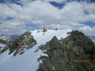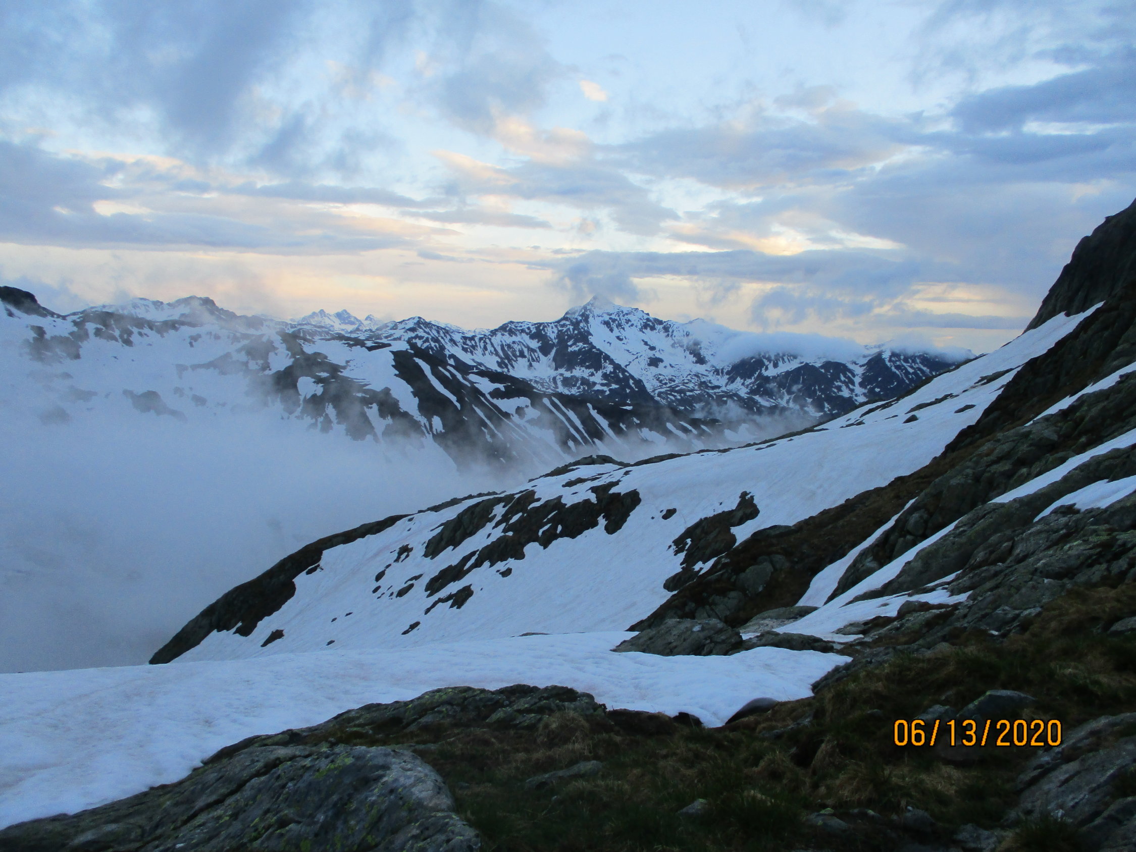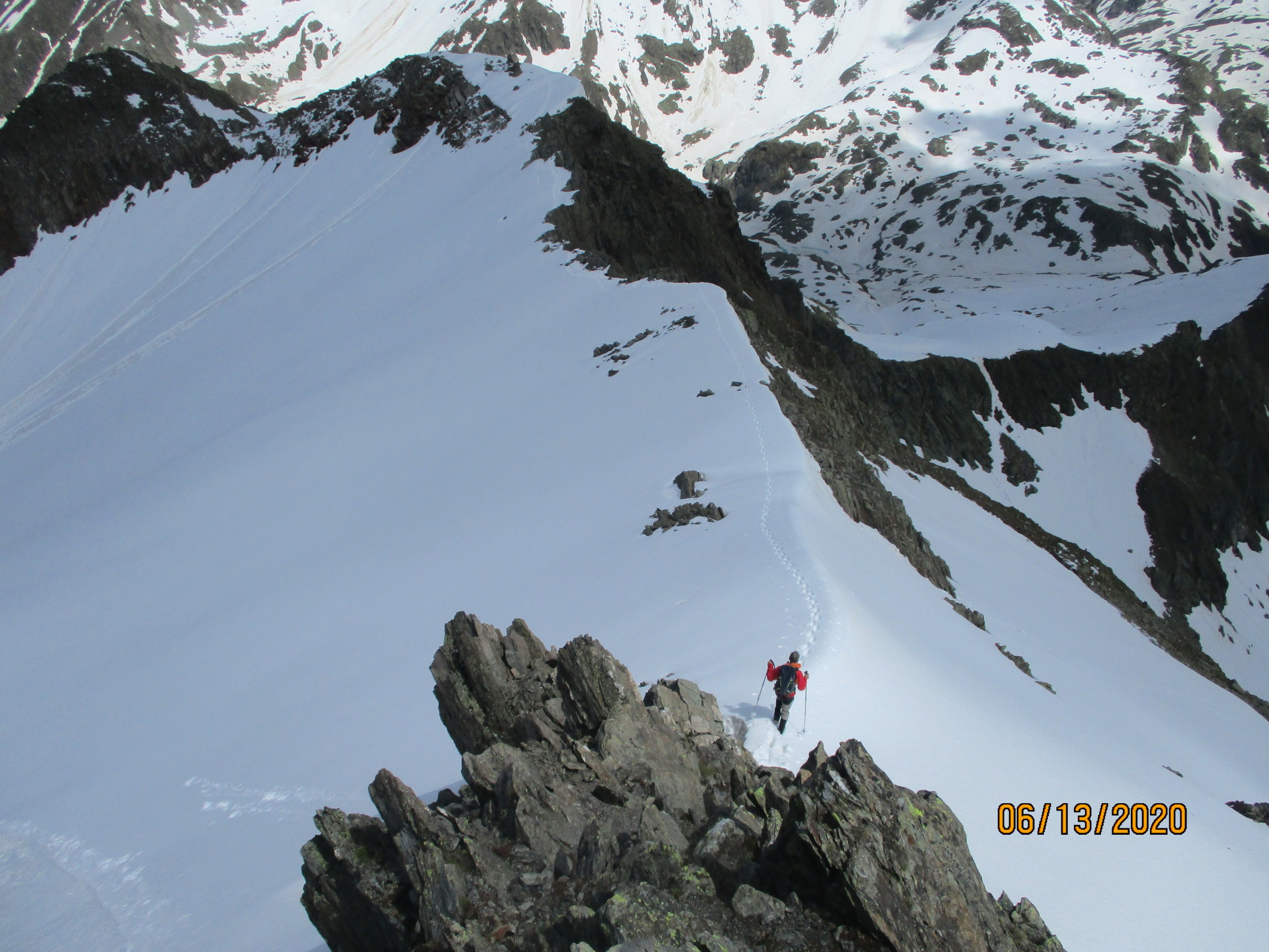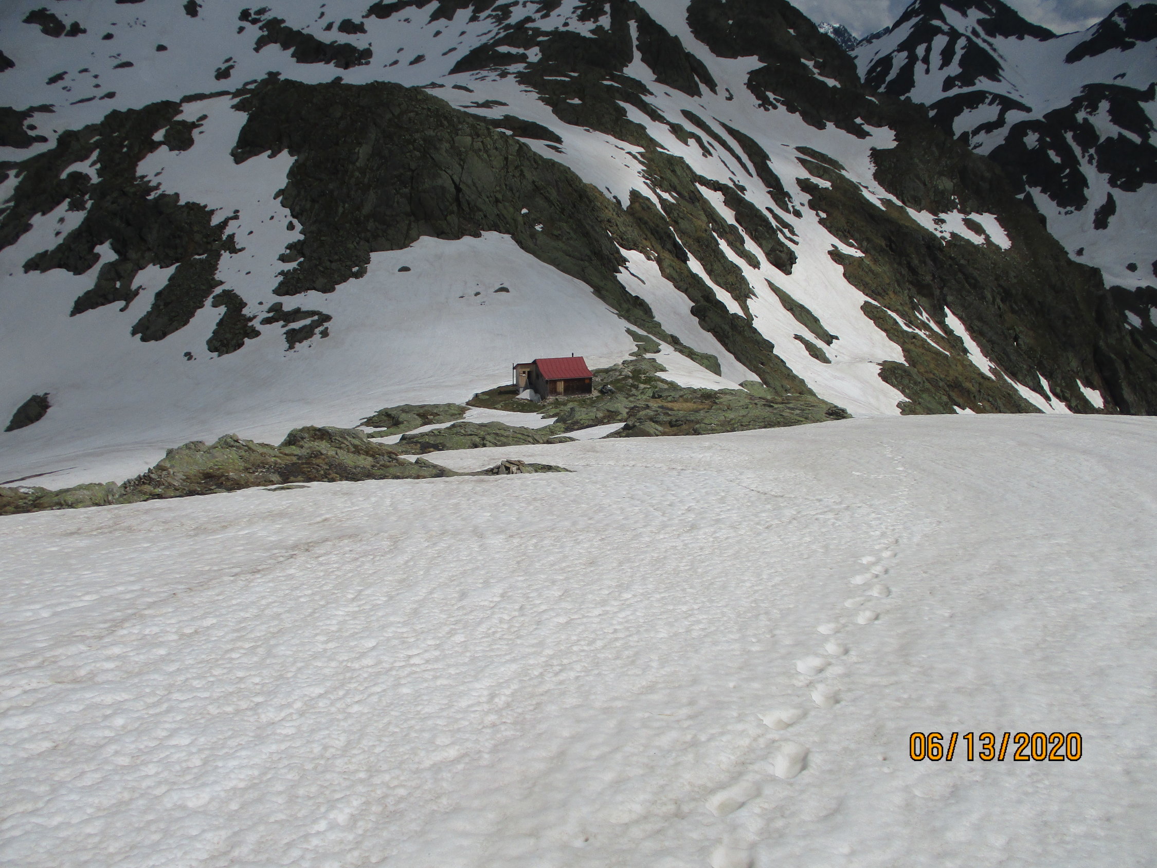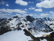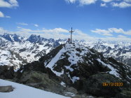 Kräftiges Schneewühlen war nötig. Ansonsten großartige Aussicht bei zu Beginn strahlend blauem Himmel. Wir gönnten uns einen mehr als 3-stündigen Gipfelaufenthalt in dessen Verlauf immer mehr Wolken aufzogen. Abends an der Hütte dann kräftige Niederschläge, einhergehend mit stürmischem Wind.