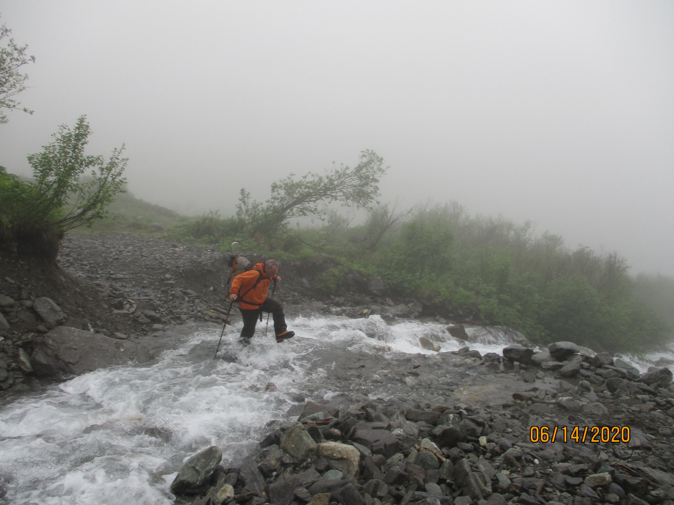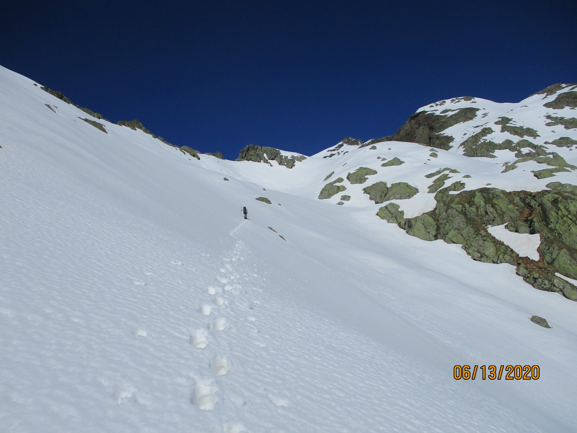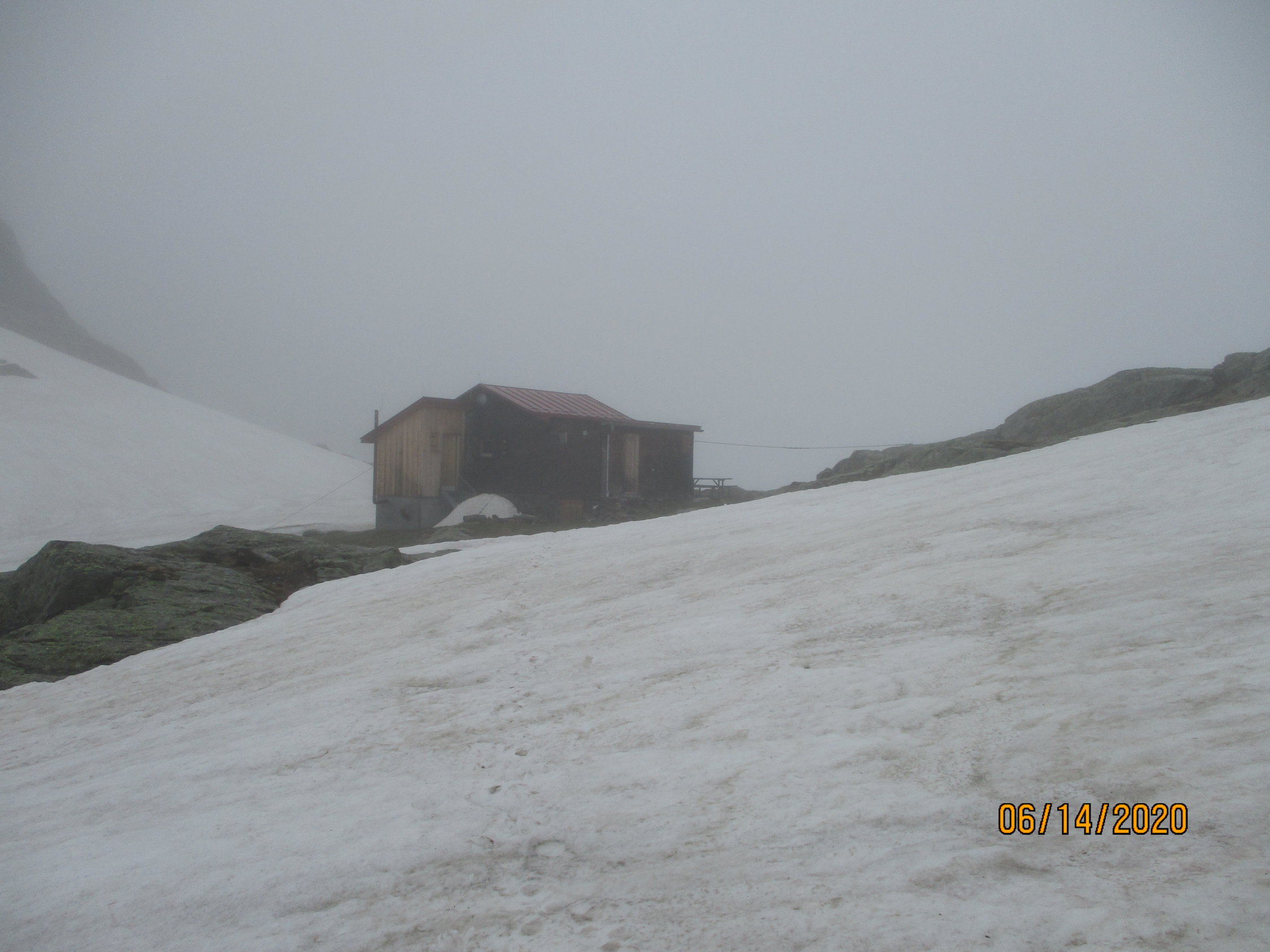 Sonntag Talabstieg in leichtem Nieselregen. Anfangs verlangte der Nebel in Kombination mit geschlossener Schneedecke im Bereich der Hütte einen gewissen Orientierungssinn. Eine Bachquerung im Nenzigasttal sorgte für nasse Füße.