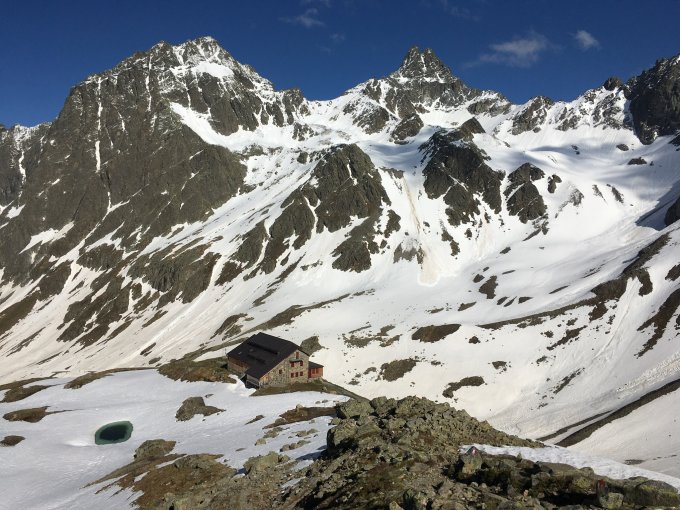 Bis zur Darmstädter Hütte nur einzelne Schneefelder, die von der Sonne ausreichend aufgeweicht waren für eine Querung mit Bergstiefeln.