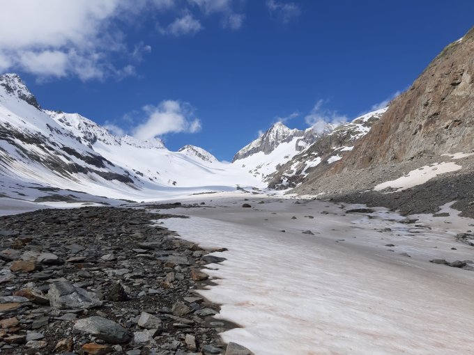Der Gletscher ist bis ans Gletschertor gut eingeschneit und konnte problemlos mit Ski befahren werden.