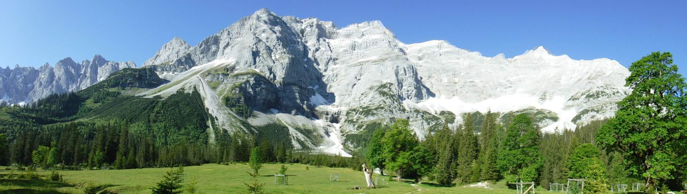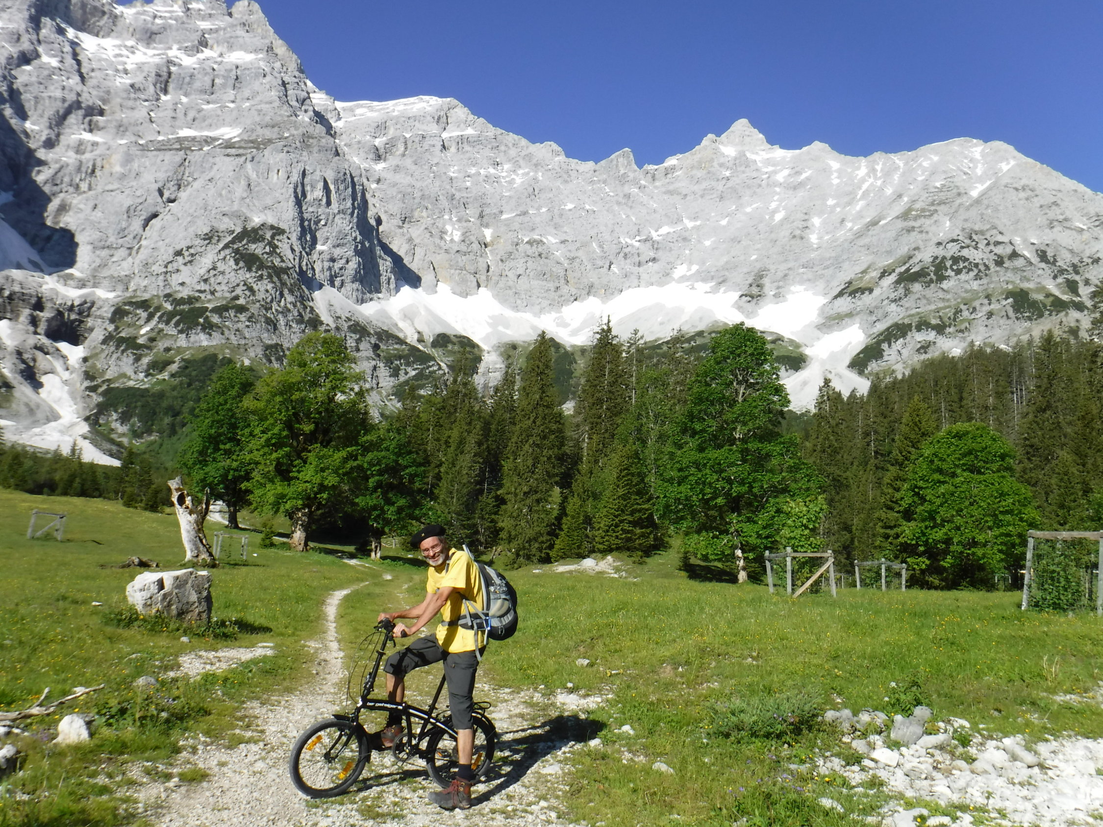 Tourenbeginn um 06:30 Uhr bei 8°C unter wolkenlosem Himmel. Mit dem Bergsteiger-Mini-Rad bis zum Kleinen Ahornboden. Ist zu empfehlen, da der Abstieg sonst lang wird.