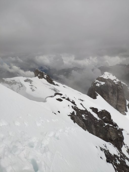 Es hat ungemein viel Schnee in der gesamten Wand und auch schon auf dem Stäfelifirn. Der Schnee ist schwer, Nass und trägt nicht. Auf dem Stäfelifirn bis zu den Knien eingesunke, das wurde dann immer mehr. Kurz vor dem Grat bis zum Bauchnabel eingesunken und ein Vorwärtskommen war kaum mehr möglich, das selbe Bild auf dem Grat, wie haben daher gedreht. Bergschrund lässt sich sowohl beim linken wie rechten Couloir überwinden, links ist es, wenn es so weichist etwas knapp, rechts ist es etwas besser.