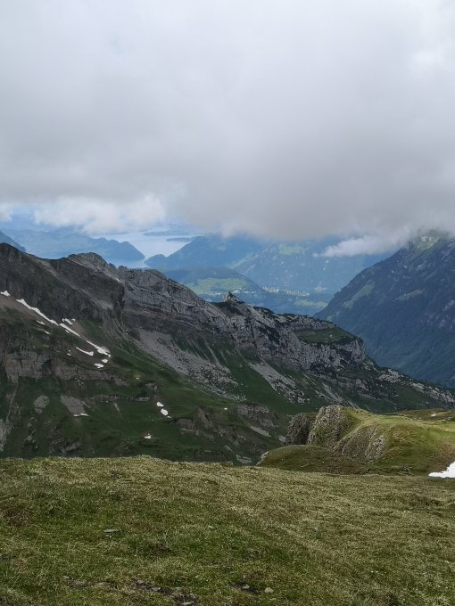 Weg zum Rossstock noch ein Schneefeld. Gipfel wieder im Nebel. Dafür Munggen und Schneehühner gesehen.