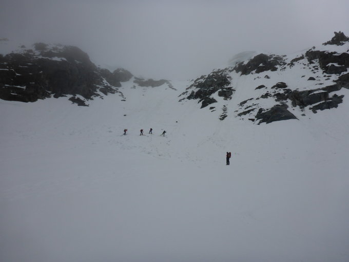 300 Hm Ski tragen, ab Gletscher sehr gut eingeschneit. Rinne auf Grat tiefer durchfeuchteter Schnee. Abfahrt ab Gipfel. Gletscher um 13 Uhr mit Bremsschnee, früher wenn es friert sicherlich sehr gut.