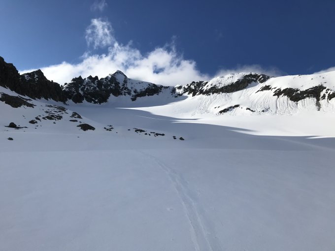 Schnee recht hart, daher Skidepot in der Flanke zum Grat.