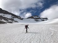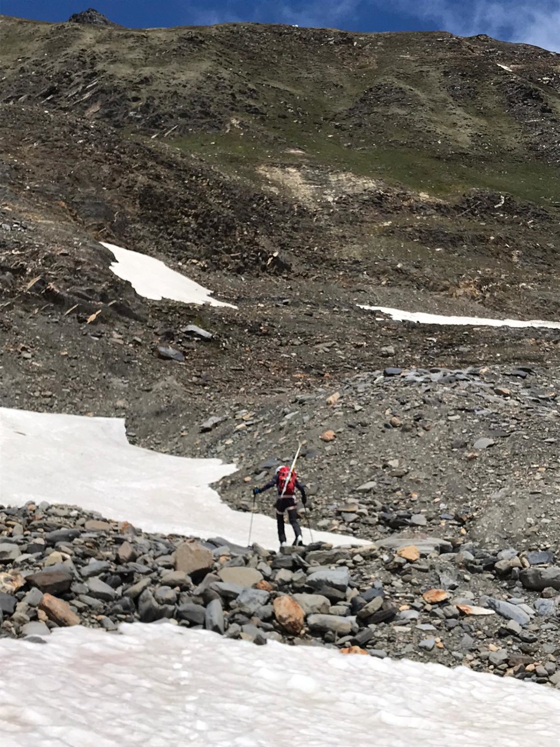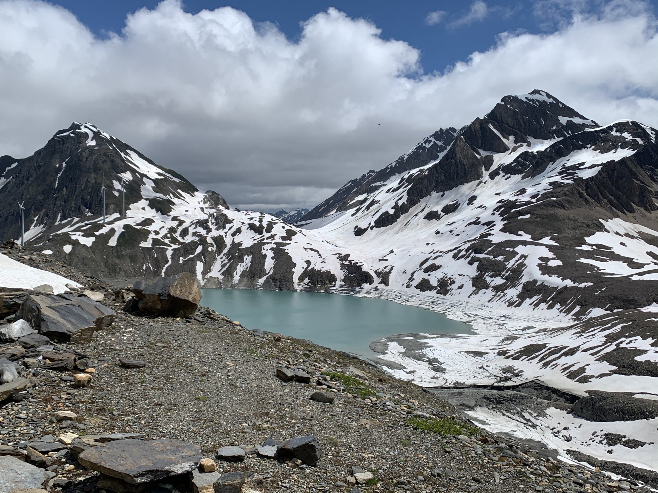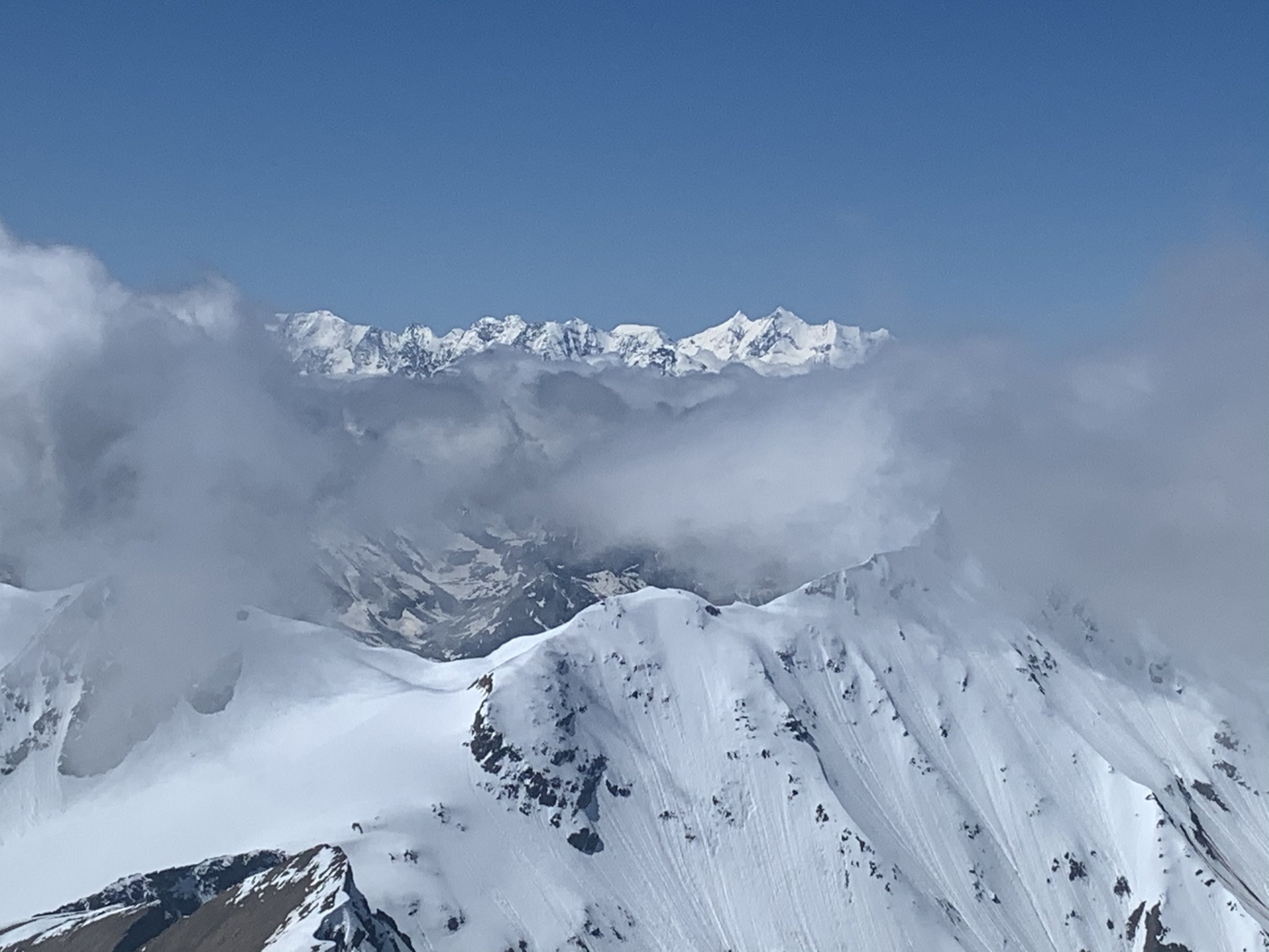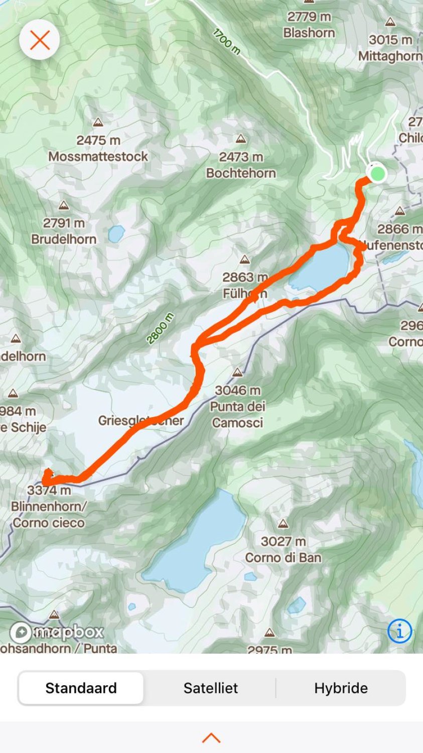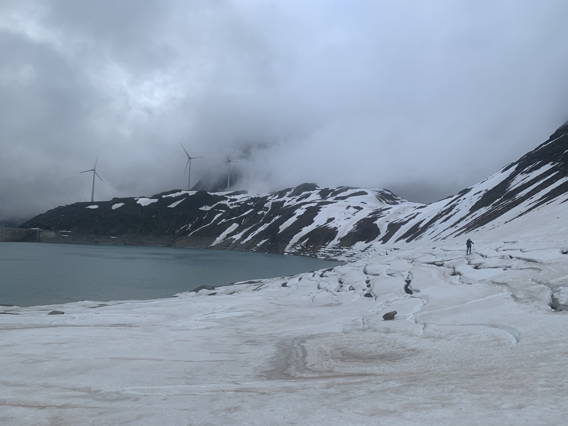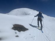 Start 2303m Nufenenpass Strasse, heute am Anfang noch Stürmisch mit leichter Regen und Nebel. Später immer besser. Hinauf sind wir richtung Mändeli und östlich um Griessee und ab da eigentlich alles bis auf den Gipfel mit Ski. Gletscher Spalten zonen alles gut bedeckt und tragend zum laufen aber feucht. Zurück westlich um Griessee auf wanderweg (Ski tragen nach Gletscher Abfahrt) und Staudamm bestens. Schnee ab 2700m rot/staub bremsend. Haben es genossen; gute fernsicht.