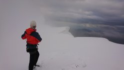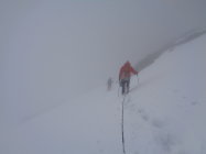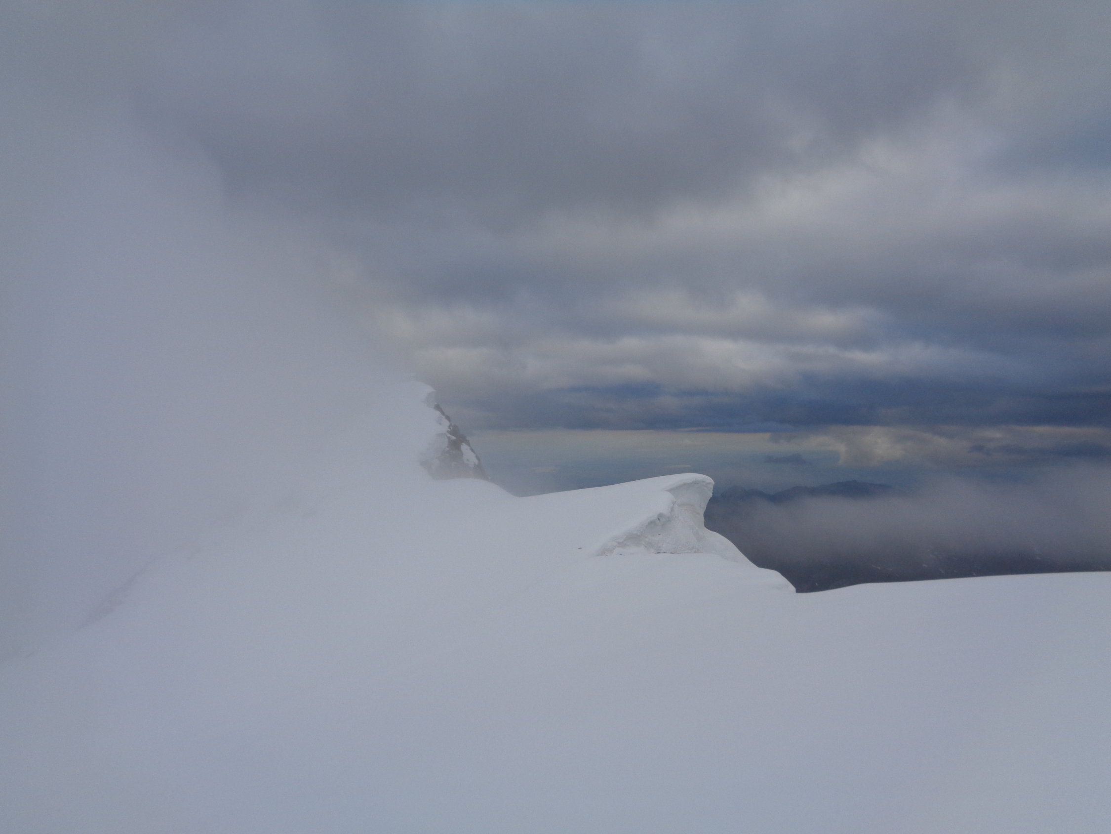 Auf dem Gipfel leichter Schneefall. Sehr eindrücklich die riesigen Schneewächten auf dem Gipfelgrat.