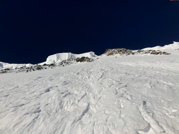 Aufgefirnt/ pulvriger Schnee eine Blankeisstelle auf oberer Serac Höhe. Ehr wenig Schneeauflage.