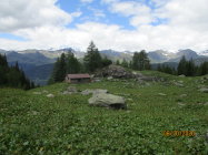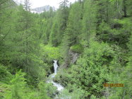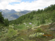 Das Schäferhüttchen auf der Alpe Cara ist im Internet als Notunterkunft deklariert.Zur Übernachtung eignet es sich dann tatsächlich nur für Spartaner, die schon einiges gewohnt sind. Es bietet Platz für etwa 4 Personen in einem Strohlager. Schlafsack obligatorisch, Isomatte und eigener Kocher, inklusive Geschirr empfehlenswert. Der nicht sehr appetitlich aussehende Gaskocher wurde von mir nicht auf Funktionstüchtigkeit überprüft. Das Hüttchen befindet sich auf einer von Lärchenwald umstandenen Lichtung mit prachtvoller Kulisse u.a. zum Poncione Sambuco, in der Nähe tost pittoresk ein Wasserfall.