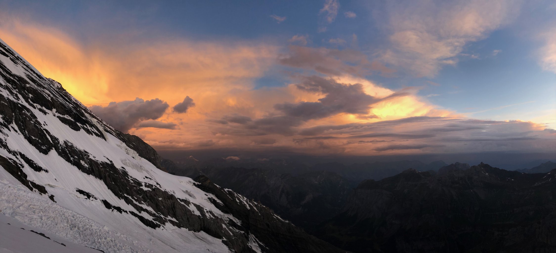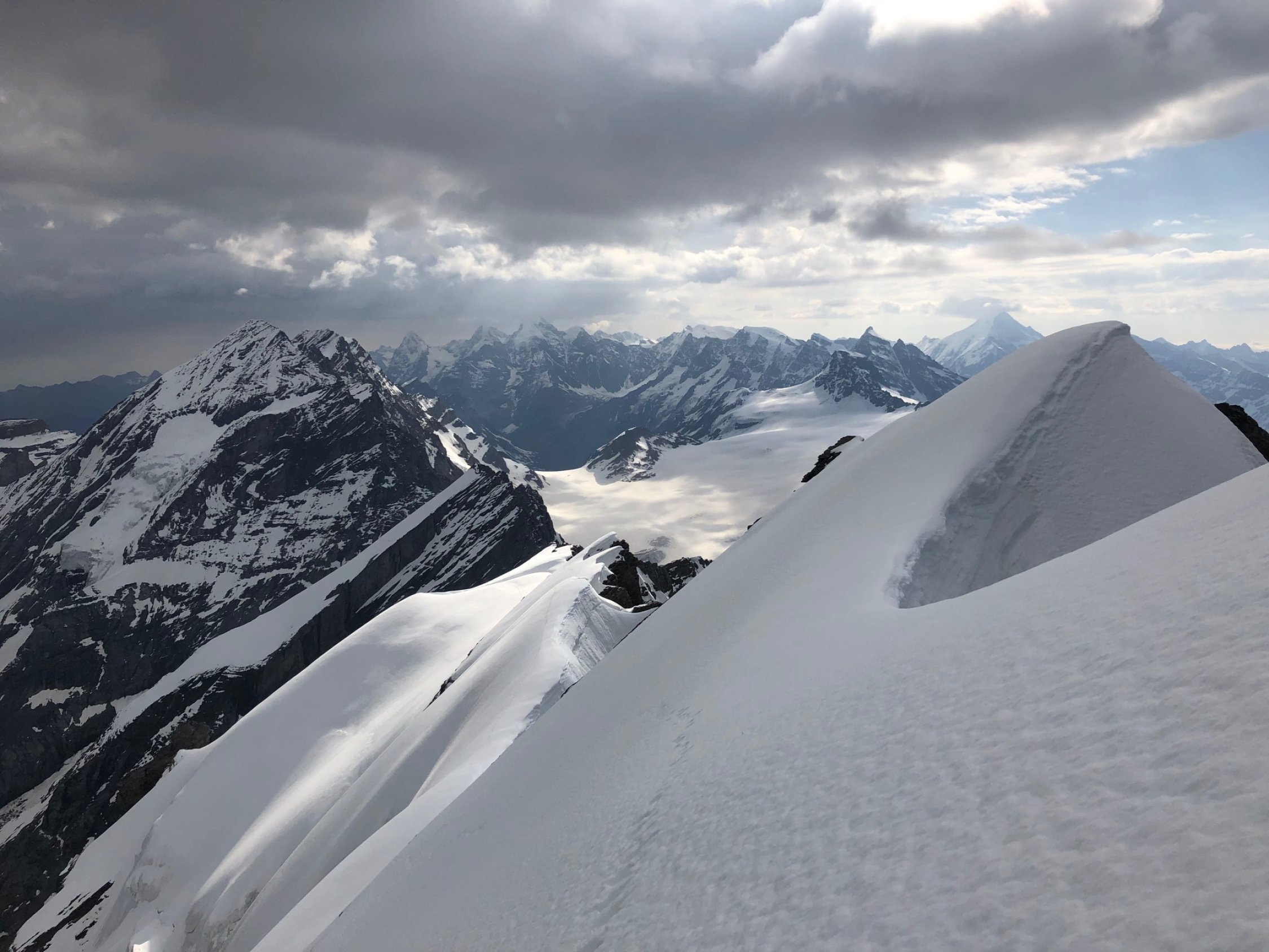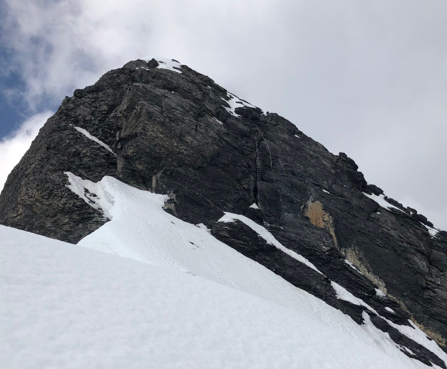Start Fründenhütte 3:45 Uhr bei milden Temperaturen. Band zum ersten Steinmann trocken. Im folgenden Firn ist man ca. Knöcheltief eingesunken, hat aber gut gehalten. Lokal auch tiefer eingesunken was das Spuren eher hart gemacht hat. Im ersten Kamin mit Stahleilen kommt einem viel Wasser entgegen. Bei dieser Canyoning Einlage sind die Handschuhe dann auch gleich komplett nass, was bei den Temperaturen aber nicht weiter schlimm war. Abwärtsgeschichtete Platte bei Querung nass aber kein Eis, gut zu machen. Die weiteren Sicherungsstangen, Taue und Ketten sind alle frei. Der Firngrat war top, ohne apere Stellen. Um ca. 9 Uhr am Gipfel vom Wind empfangen worden.