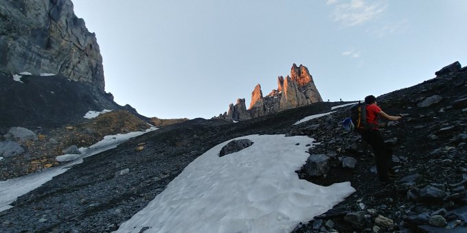 Start um 04:45 ab der Spannorthütte, bei etwas Wind und recht warmen Temperaturen. Unterhalb der Schlossberglücke sind noch zwei, wenig steile, Schneefelder zu queren, die heute früh bereits recht weich waren.