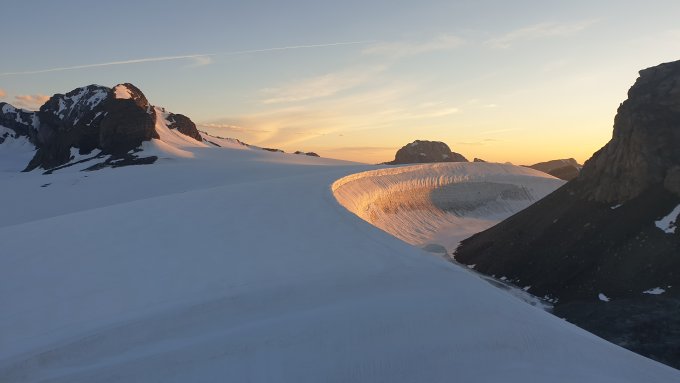 Der Hüfigletscher und das Iswändli sind sehr gut mit Schnee bedeckt. Im Aufstieg und in den Querungen ab Planurahütte bereits früh am Morgen (6.20 Uhr) kaum tragbar, weil zu warm und nur kurze nächtliche Abstrahlung. Aufstieg über die Ostflanke mühsam aber gut machbar. Keine Randkluft. Abstieg über den Kettenweg gut machbar. Vorsicht am verschneiten, ausgesetzten Gipfelgrat!