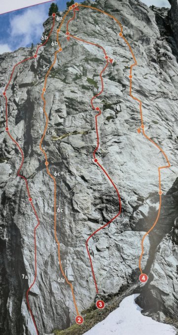 Horenfelli, Felswand oberhalb Alp Horenfelli: Indian Summer 6b(+), 6a+ obli