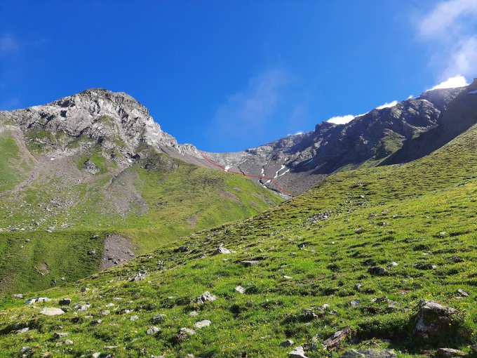 Statt wie in der Routenbeschreibung beschrieben nicht den Marchtalsattel ansteuern, sondern den Hang neben dem Felskopf rechts vom Marchtalsattel (2657). Dieser Felskopf ist enorm brüchig und bei den heutigen nassen Verhältnissen ebenso rutschig. Schon wieder im Abstieg hat haben mich ebenfalls hochsteigende Hirten der Alp auf diesen Weg hingewiesen, war dann absolut kein Problem.