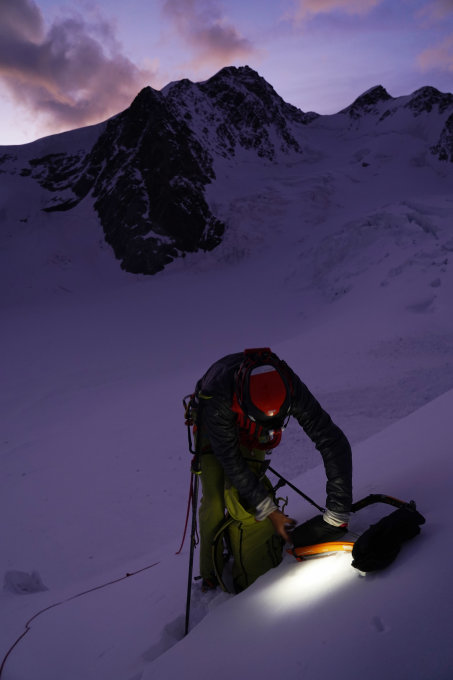 Seit Jahren beobachte ich die Nordostwand von Liskamm. Ich wollte schon immer die Neruda-Klucker-Route machen, weil ich dachte, es wäre die sicherste in der Nordostwand. In den letzten Jahren war der Neruda-Klucker oft eisig und im oberen Teil zeigten sich einige Felsabschnitte. Ich sah vor Ort, dass es eine gute Möglichkeit geben würde, den unteren Teil der Benedetti-Route mit dem Welzenbach Couloir zu kombinieren. Die Idee war, direkt unter dem Felsenteil des zweiten Teils der Benedetti-Route zu klettern und von dort zum Welzenbach-Couloir zu traversieren. Im Welzenbach ist das Ambiente einfach unbeschreiblich. Und als letzter Schritt dieser großen Linie geht es aus dem Couloir auf den Ostgipfel von Lyskamm (4527 m). Im Topo heißt es, dass das Welzenbach-Couloir selten wegen Serac-Gefahr begangen wird. Es ist wahr, dass die Hänger im linken Teil der Wand enorm sind, aber mit der Vermeidung des unteren Teils, wo man die maximale Exposition hat, sollte dieses große Couloir eine Wiederbelebung bekommen.