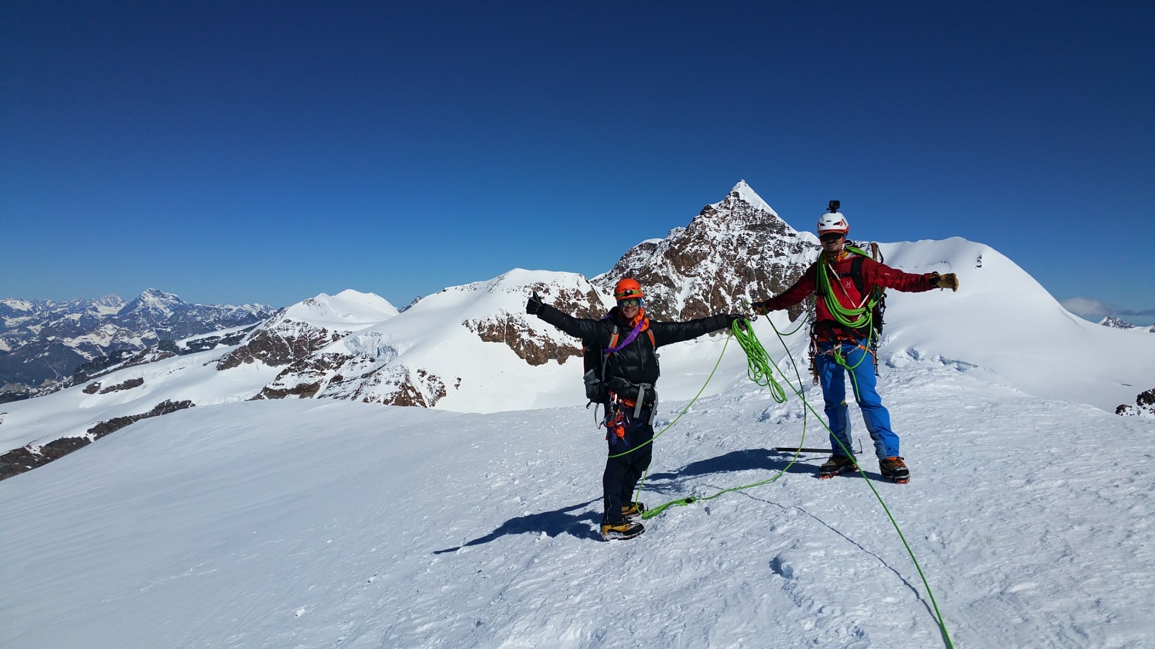 Abhängig vom sehr wechselwilligen Wetter. Der Grenzgrat an der Dufourspitze hat ebenfalls winterliche Bedingungen, deshalb ausgelassen und über den gut eingeschneiten Grenzgletscher zur Monte Rosa abgestiegen.