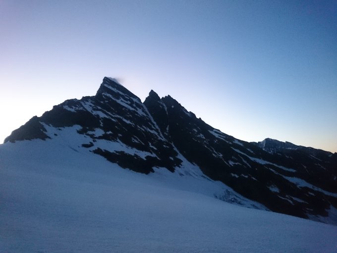 Gletscher noch gut eingeschneit, ein paar Spalten machen sich jedoch ganz langsam bemerkbar. Am Westgrat mehrheitlich trockene Verhältnisse angetroffen, haben erst im letzten Drittel die Steigeisen montiert. Die Querung den Eisenstangen entlang in die Südflanke ist momentan nicht wirklich zu empfehlen, weil sie teilweise noch eingeschneit sind und es keine alternative Sicherungsmöglichkeiten gibt - besser den Stangen entlang dem Grat folgen, da ist der Fels auch schön solide. Im Abstieg kann man daran auch gut abseilen.