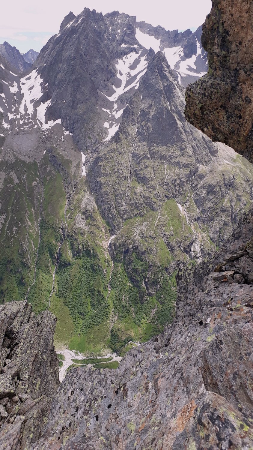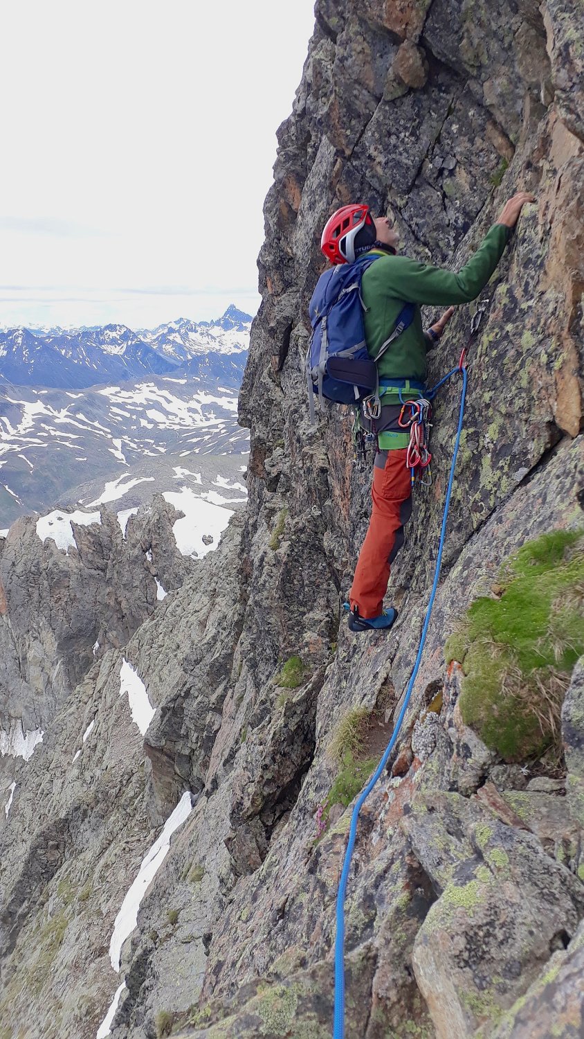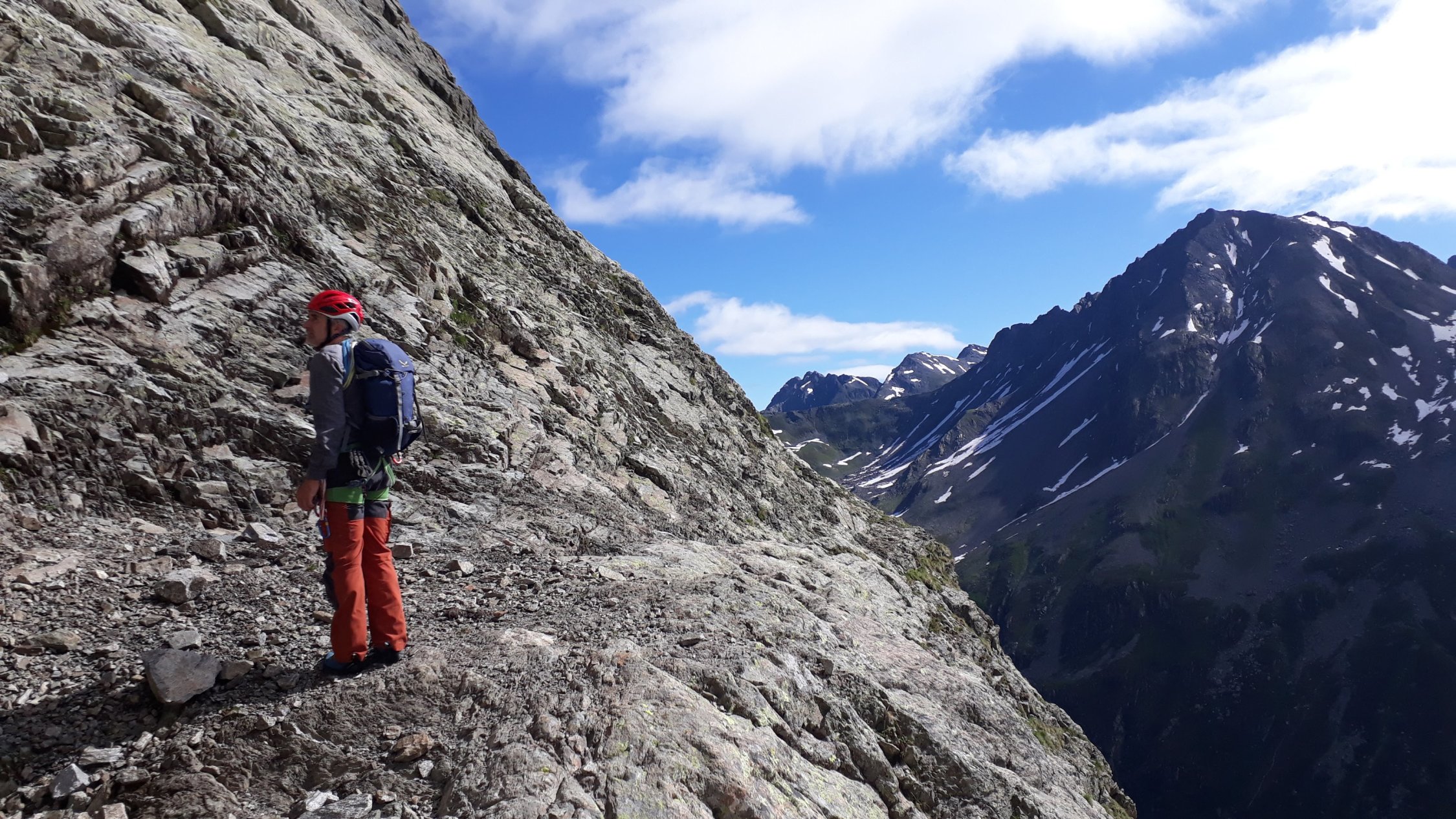 Wir sind von der Salzhütte (1490m) mit den Rädern an der Konstanzer Hütte vorbei den Fahrweg durch das Fasultal bis auf 1890 m gefahren. Hier befindet sich ein Steinmann, der den Beginn eines schwach ausgetretenen Pfads anzeigt. Diesen Pfad, der sporadisch mit weiß roten Markierungen versehen ist, ziemlich gewunden, botanisch und steil nach oben, bis wir eine freie Anhöhe rechts des ersten großen Schneefeld erreicht haben (2350m). Den sporadischen Bohrhaken entlang geradeaus hoch, immer über dem Schneefeld hinein in den grossen Ostwandkessel, der sich nach einer Verengung öffnet. Hier in einem großen Rechtsbogen nach oben bis zu einem schwach ausgeprägten Schuttband. Von hier zunächst über steileren Fels, später wieder mehr grasschrofiges Gelände in nördlicher Richtung zum NO-Grat hoch. Toller Blick nach Norden. Weiterhin ohne Sicherung über den zunächst gutmütigen Grat, später am langen Seil, schließlich, als der Grat sich aufsteilt, mit regulärer Standplatzsicherung. In tollem, trockenem Fels nach oben, die letzten Seillängen sind die schwersten, die Schlüsselstelle ist sehr ausgesetzt, aber gut abgesichert. Leider gab es am Gipfel nicht mehr den vorhergesagten, wolkenlosen Himmel. Zumindest hat es nicht geregnet, was für diese Kletterei fatal wäre. Im Abstieg nach Süden sperren einige labile Schneefelder die Querung vorbei am Südgipfel, den man normalerweise nicht besteigen muss. Wir sind ziemlich heikel(da sehr brüchiges und loses Gestein) weiter nach unten gestiegen, um später wieder auf den Grat nach dem Südgipfel hochzuklettern. Vielleicht wäre es besser gewesen, bei den aktuellen Bedingungen über den Südgipfel auf diesen Grat zu gelangen. Bei Steinmann auf einer schwach ausgeprägten Rippe in IIer Gelände 150 Hm nach SO hinunter, lange Querung nach rechts bis zu einer Schlucht, durch man wieder etwas linkshaltend den mittleren Steilriegel der SO-Wand durchsteigt. Gleich am Anfang der Schlucht gibt es ein längeres steiles Schneefeld, das man nur am Rand über steile, nasse Platten umgehen kann. Besser war es für uns, das Schneefeld mit Pickel nach unten zu steigen (Ohne Pickel nicht ratsam). Am Ende der Schlucht weiteres Abklettern in IIer Gelände, bis man die unteren Schneefelder erreicht. Ab hier über viel Schnee nach unten, bis man auf den Bruckmannweg trifft.