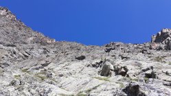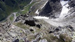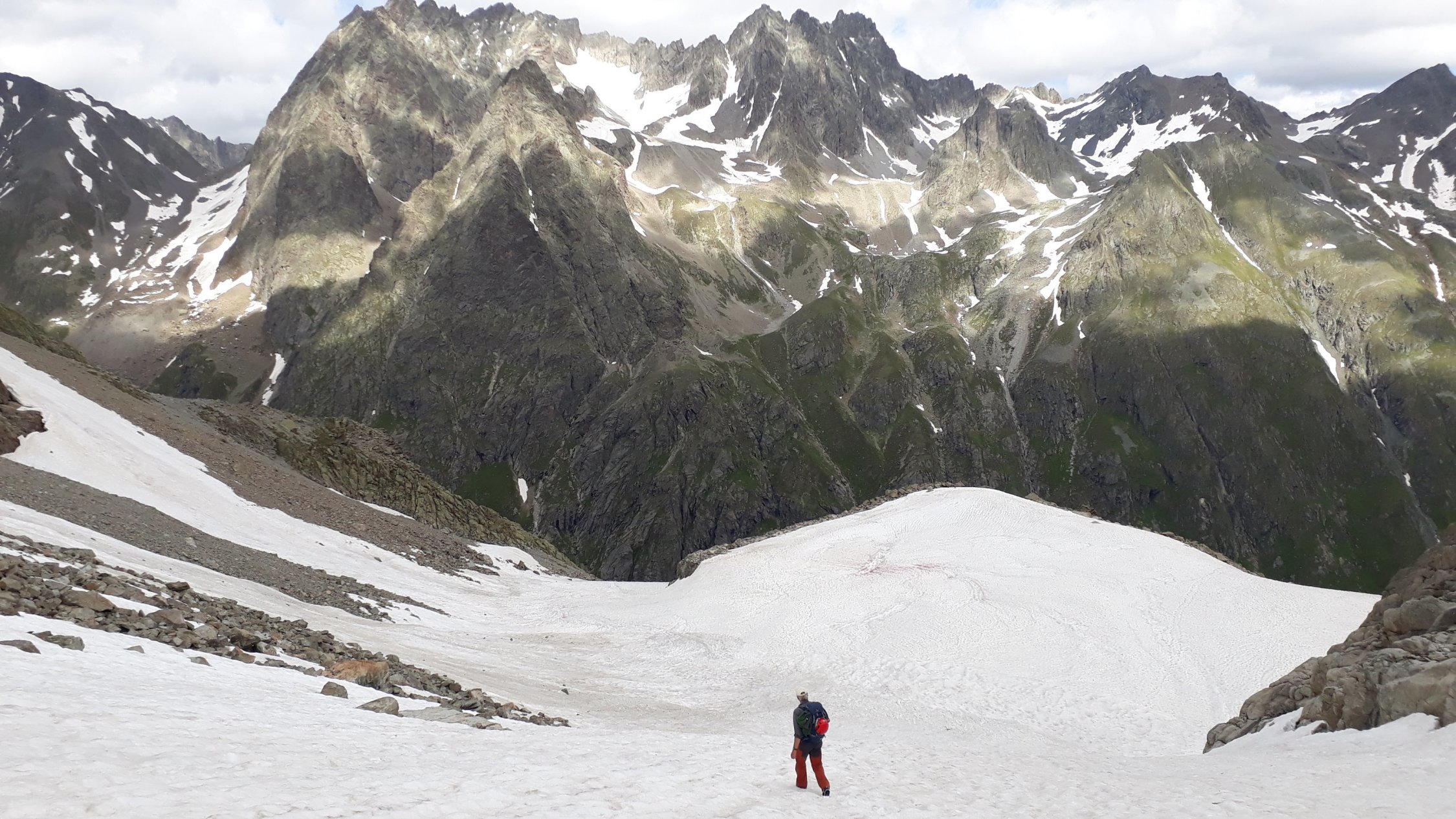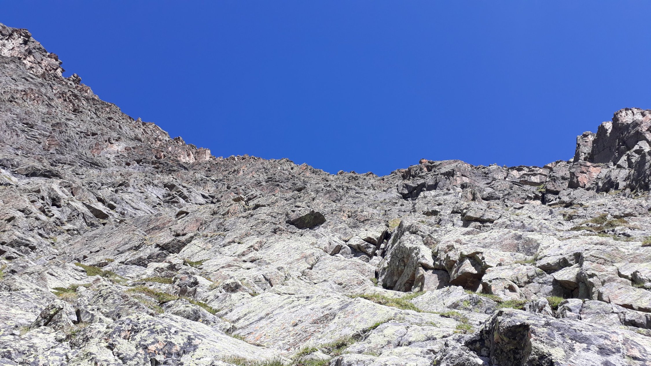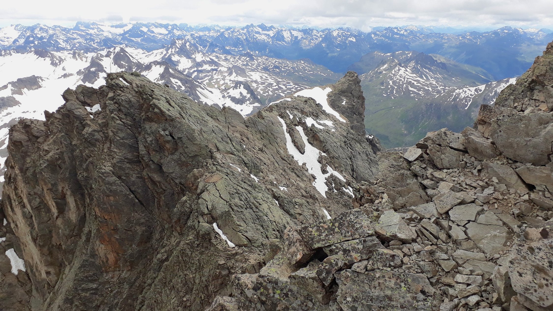 Wir sind von der Salzhütte (1490m) mit den Rädern an der Konstanzer Hütte vorbei den Fahrweg durch das Fasultal bis auf 1890 m gefahren. Hier befindet sich ein Steinmann, der den Beginn eines schwach ausgetretenen Pfads anzeigt. Diesen Pfad, der sporadisch mit weiß roten Markierungen versehen ist, ziemlich gewunden, botanisch und steil nach oben, bis wir eine freie Anhöhe rechts des ersten großen Schneefeld erreicht haben (2350m). Den sporadischen Bohrhaken entlang geradeaus hoch, immer über dem Schneefeld hinein in den grossen Ostwandkessel, der sich nach einer Verengung öffnet. Hier in einem großen Rechtsbogen nach oben bis zu einem schwach ausgeprägten Schuttband. Von hier zunächst über steileren Fels, später wieder mehr grasschrofiges Gelände in nördlicher Richtung zum NO-Grat hoch. Toller Blick nach Norden. Weiterhin ohne Sicherung über den zunächst gutmütigen Grat, später am langen Seil, schließlich, als der Grat sich aufsteilt, mit regulärer Standplatzsicherung. In tollem, trockenem Fels nach oben, die letzten Seillängen sind die schwersten, die Schlüsselstelle ist sehr ausgesetzt, aber gut abgesichert. Leider gab es am Gipfel nicht mehr den vorhergesagten, wolkenlosen Himmel. Zumindest hat es nicht geregnet, was für diese Kletterei fatal wäre. Im Abstieg nach Süden sperren einige labile Schneefelder die Querung vorbei am Südgipfel, den man normalerweise nicht besteigen muss. Wir sind ziemlich heikel(da sehr brüchiges und loses Gestein) weiter nach unten gestiegen, um später wieder auf den Grat nach dem Südgipfel hochzuklettern. Vielleicht wäre es besser gewesen, bei den aktuellen Bedingungen über den Südgipfel auf diesen Grat zu gelangen. Bei Steinmann auf einer schwach ausgeprägten Rippe in IIer Gelände 150 Hm nach SO hinunter, lange Querung nach rechts bis zu einer Schlucht, durch man wieder etwas linkshaltend den mittleren Steilriegel der SO-Wand durchsteigt. Gleich am Anfang der Schlucht gibt es ein längeres steiles Schneefeld, das man nur am Rand über steile, nasse Platten umgehen kann. Besser war es für uns, das Schneefeld mit Pickel nach unten zu steigen (Ohne Pickel nicht ratsam). Am Ende der Schlucht weiteres Abklettern in IIer Gelände, bis man die unteren Schneefelder erreicht. Ab hier über viel Schnee nach unten, bis man auf den Bruckmannweg trifft.