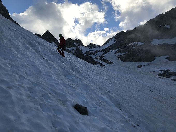 Beim Abstieg sind noch einige Schneefelder zu überqueren, die allerdings durch den weichen Trittfirn gut zum gehen waren. Bei kälteren Temperaturen sicherlich unangenehmer.