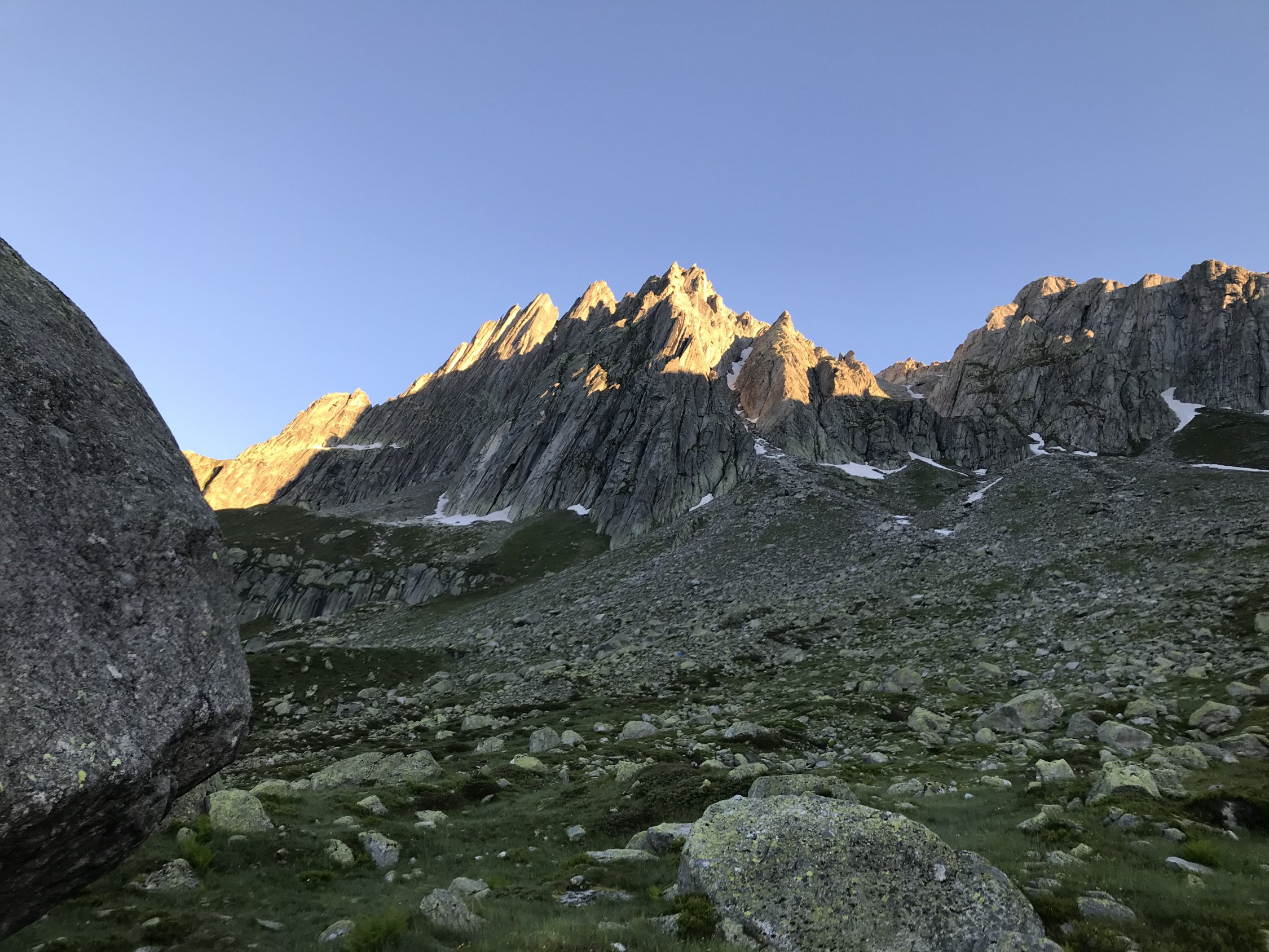Beim Start um 6:00 an der Hütte ist man voll in der Rush Hour, mit uns tummelten sich 6 Seilschaften, die sich in den ersten 5 Seillängen unangenehm aufstauten.