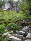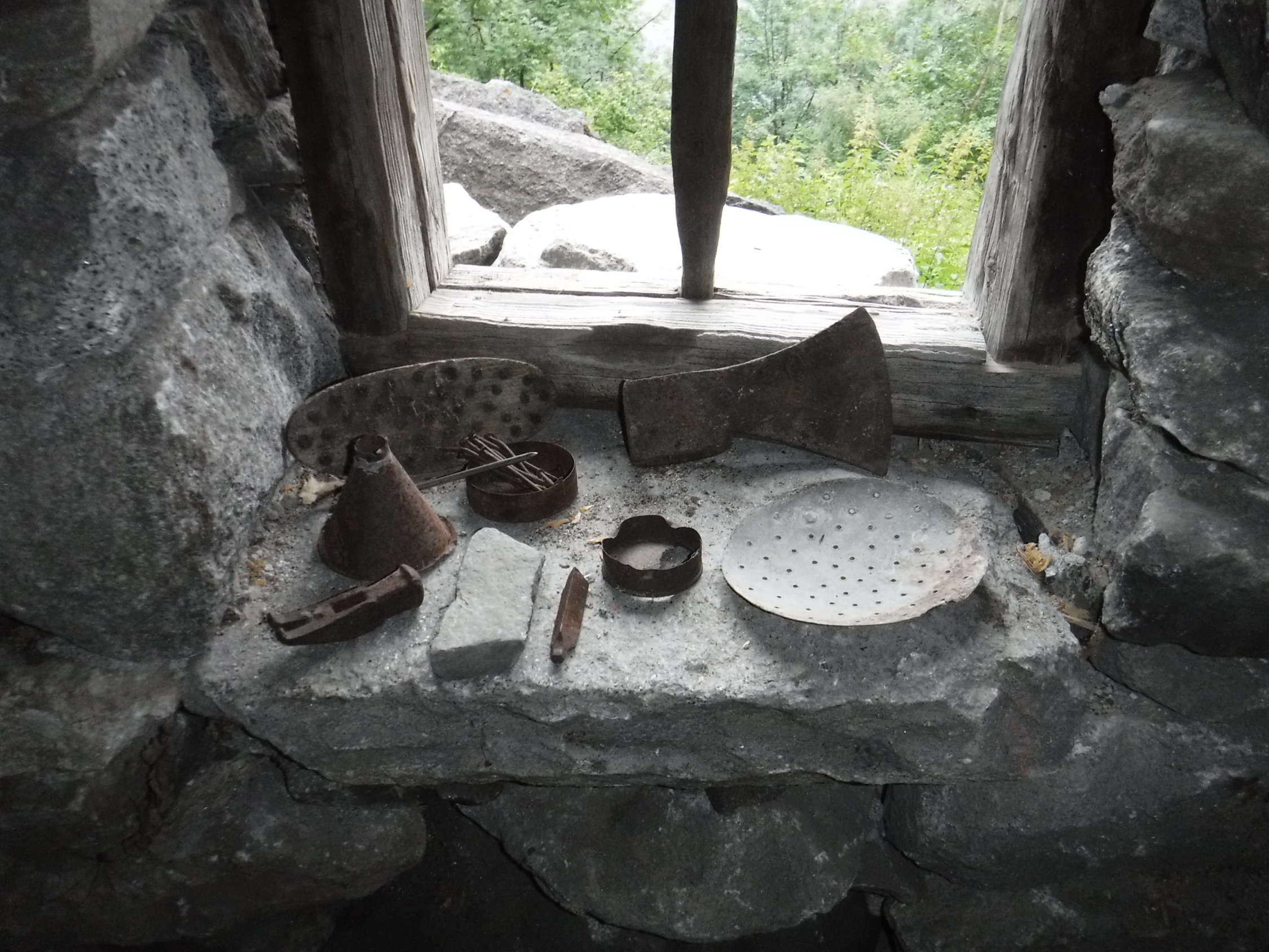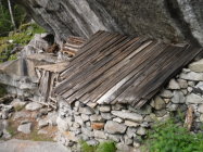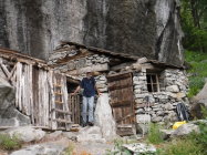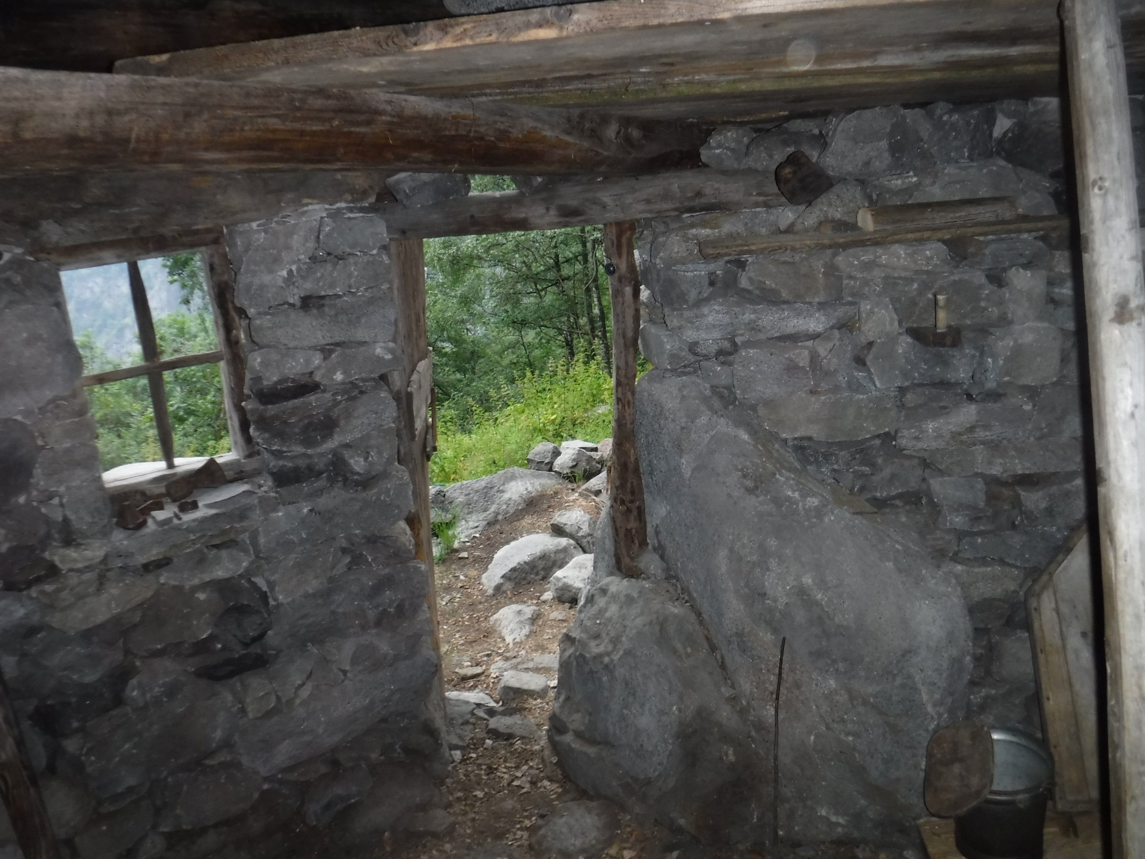 Tourenbeginn um 06:25 Uhr bei 17°C bei Hochnebel am 27.6. Der Steig bis Corte della Banèta ist gepflegt (freigeschnitten). Die alte Hütte ist wieder intakt.