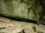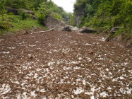 Die Steine mit ausgeblichenem roten Pfeil oder Strich drauf, fand ich nicht vor. Oder die sind inzwischen verrutscht, bzw. überschüttet worden. Ledig die Stelle der Bachbettquerung mit dem Stein, auf dem das kleine gelbe Herz mit rotem Rand draufgemalt ist, sah ich, sowie anfangs 2 Steinmandl. Doch ab Mitte Bachbett war alles verwüstet. Weiter oberhalb lag noch Altschnee und einen Aufstieg durch das Bachbett wollte ich nicht erst anfangen, weil zu viel Bäume und Murenmaterial drin lag, was für ein Forwärtskommen zeitlich fordernd geworden wäre. Ich drehte unterhalb der Seile der LSB darum um auf ca. 1450 m Höhe, nachdem ich 3 Versuche unternahm eine Stunde lang: Erst an (in Aufstiegsrichtung) rechter Bachbettseite, dann zum und im Wald und Gesträuch rechts vom Bach, schließlich links vom Bachbett, wissentlich, dass man sich zur rechten Schluchtseite orientieren muss, um es weiter oberhalb zu versuchen.