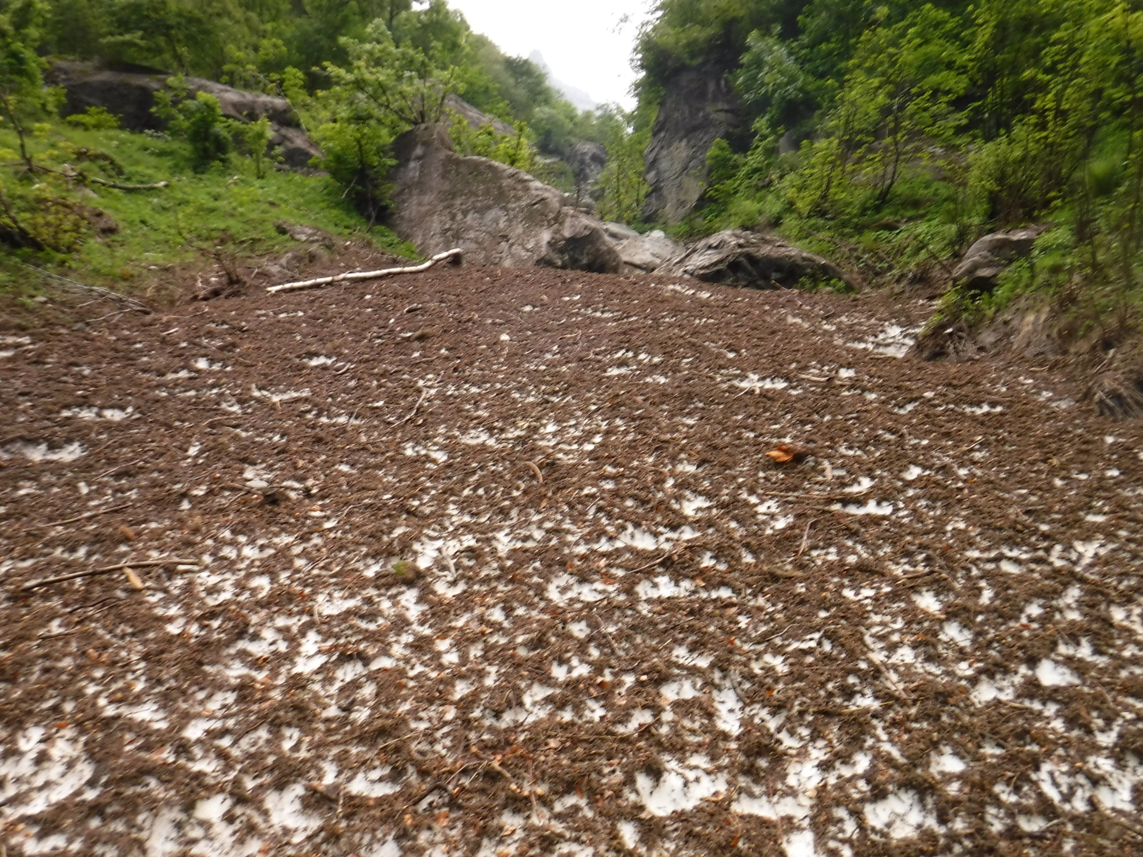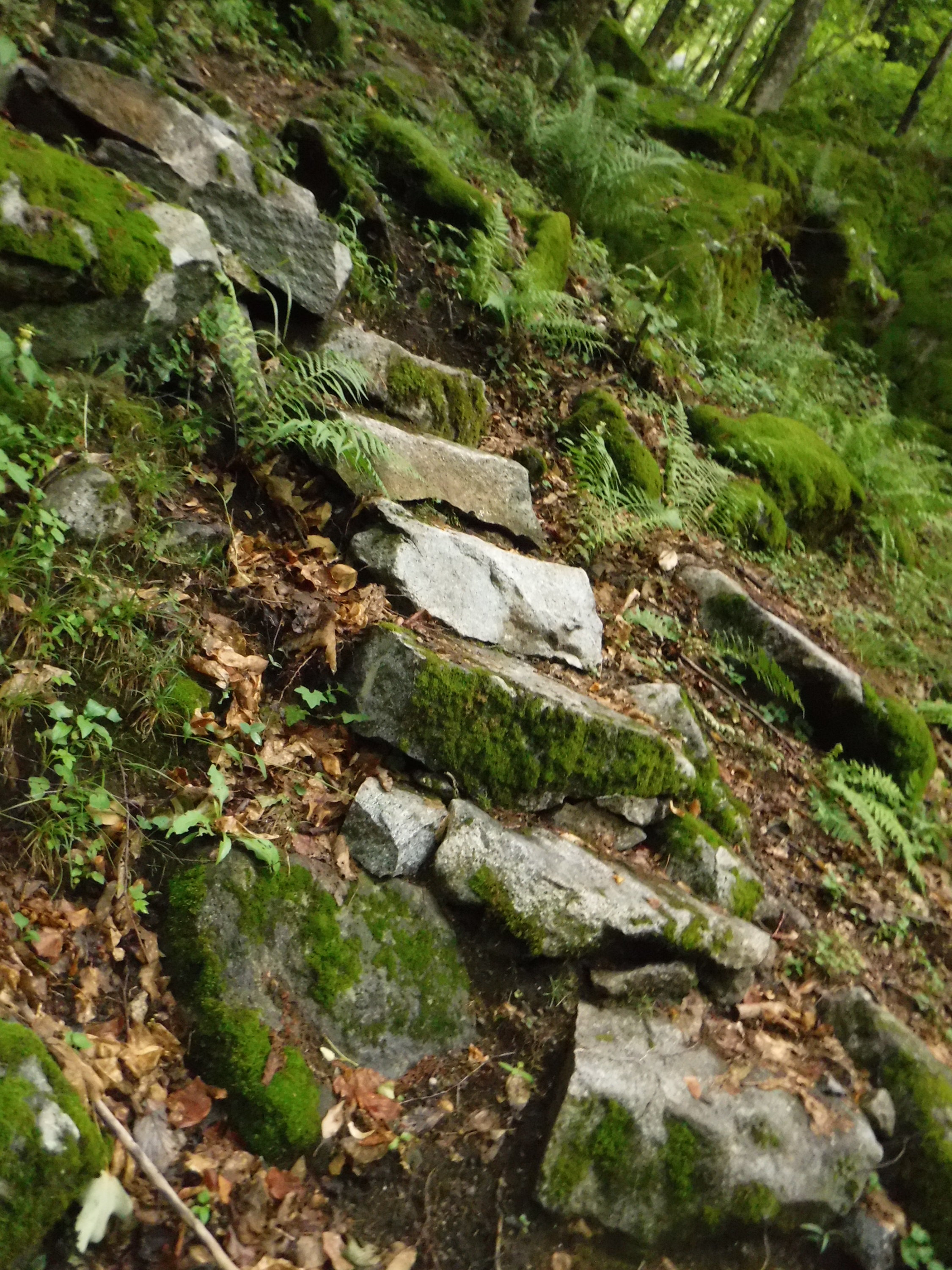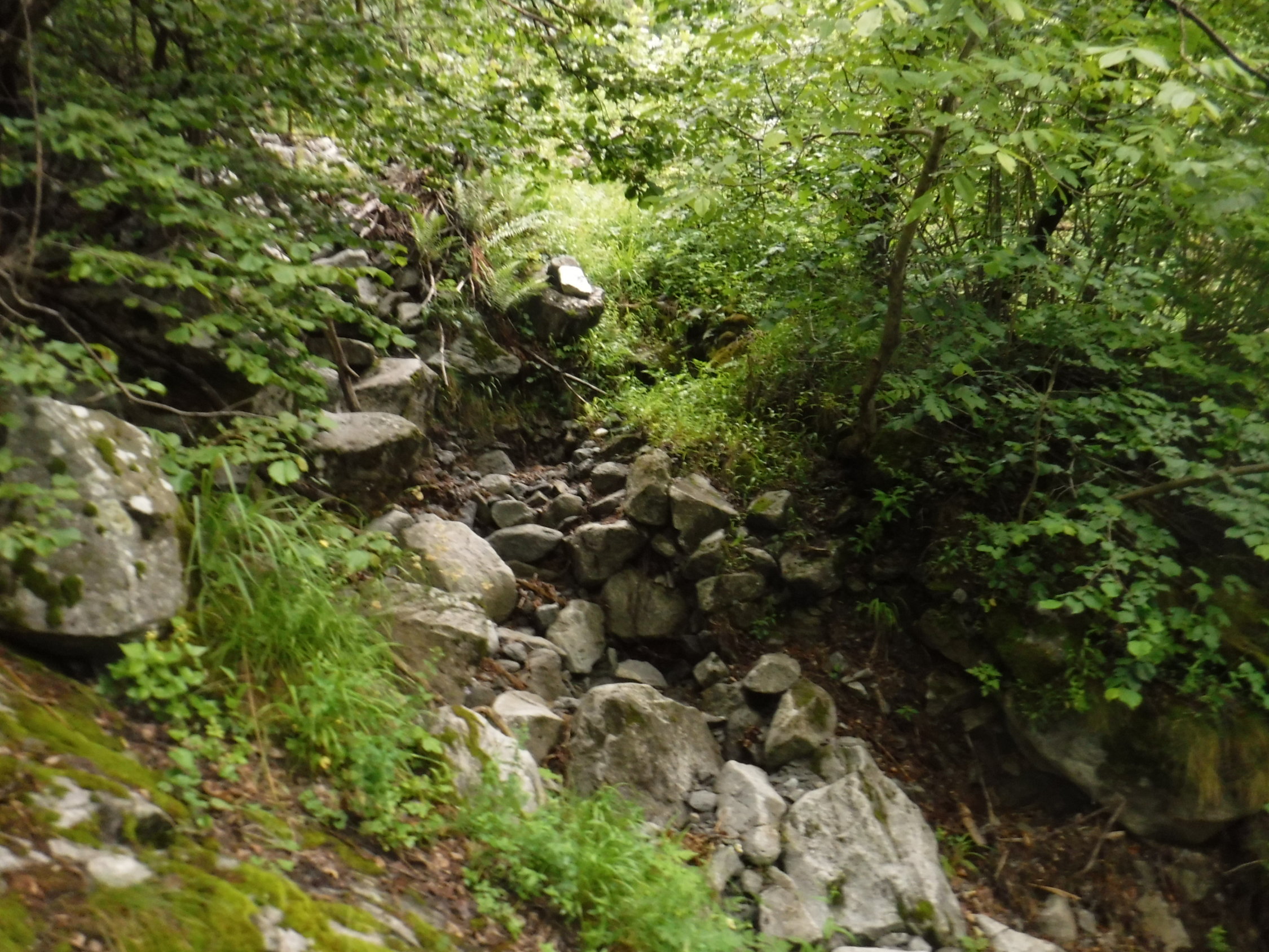 Über diesen Steig wie auch die Erschließung des engen Foioi-Tals verfasste Giuseppe Brenna das italienischsprachige Buch „Giuseppe Zan Zanini e la Valle di Foiòi“ (Salvioni Edizioni, Bellinzona, Auflage 2010, ISBN 978-88-7967-184-2). Der Verfasser ist bekannt von seinen 4 SAC-Führern. Nachdem ich mir das seit Jahren vergriffene und nicht mehr verlegte Buch über meine Wohnort-FH-Bibliothek von der Bibliothek der ETH Zürich für 1 Monat fernlieh, hatte vor, die 6 dort im Buch beschriebenen alten Routen nachzuvollziehen. Was mir jedoch nur zum Teil gelang. Die geplante Tour heute bis Ometto di Cúpol über ehemalige Alpen Sevinèra Corte Grande und Corte di La gab ich auf ca. 1450 m Höhe auf. Da ich keine Anhaltspunkte für die Fortsetzung zwischen Bachbett und (in Aufstiegsrichtung) rechter Schluchtwand mehr fand. Und für lediglich sich durch das Gehölz schlagen zu müssen, ohne was zu sehen, war ich heute nach nächtlichem Regen nicht zu haben.
