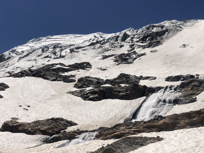 Gletscher noch gut eingeschneit - keine Blankeispassagen. Mehr Schnee als um die gleiche Zeit letztes Jahr. Westhang und Kamine komplett schneefrei ohne Steigeisen und Pickel einfach kletterbar.